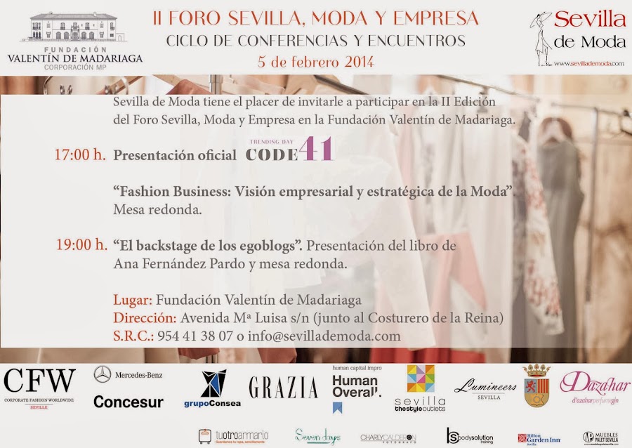 Sevilla de Moda presentará un nuevo concepto de evento en moda durante el transcurso de la II edición del Foro ?Sevilla, Moda y Empresa? a celebrar el día 5 de febrero, desde las 17 horas en la sede de la Fundación Valentín de Madariaga. Se trata de CODE41-Trending Day, un novedoso formato en el cual predominarán las acciones transversales en comunicación para las firmas participantes. Todos los detalles del mismo se darán a conocer durante la celebración de dicho Foro.