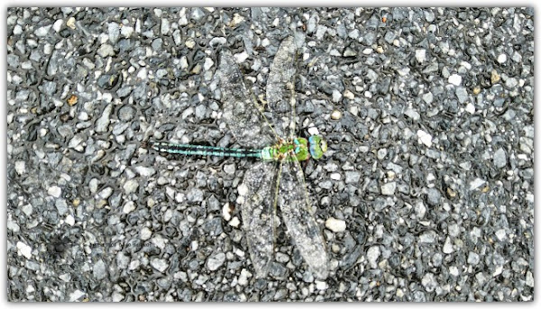 Esta foto casi parece un acertijo, "encuentra la libélula", porque estaba camuflada entre el camino y no se ve. Ese día había llovido y no sé si estaba ya cadáver o no podía volar por tener las alas mojadas, yo creo que era la primera opción porque no se movía nada, tampoco la toqué para comprobarlo.