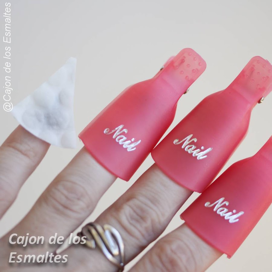 Para facilitar el proceso recomiendan cortar la uña postiza con alicate al tamaño de nuestra uña natural, limar suavemente para romper la capa externa y que penetre más fácil la acetona. Luego remojar las uñas en un recipiente con acetona hasta que se disuelva la uña postiza, estamos hablando de no menos de 15 minutos. En mi caso prefiero el método de empapar un algodón en acetona y dejar apoyado sobre la uña, pueden o bien envolver el dedo en papel de aluminio para sujetar el algodón o utilizar unas "pinzas" especiales para uñas que sirven el mismo propósito. Siguiente paso poner una película y chequear cada 5 o 10 minutos como va el tema. Luego de terminar con el pegamento una buena humectación contrarresta el efecto de la acetona.