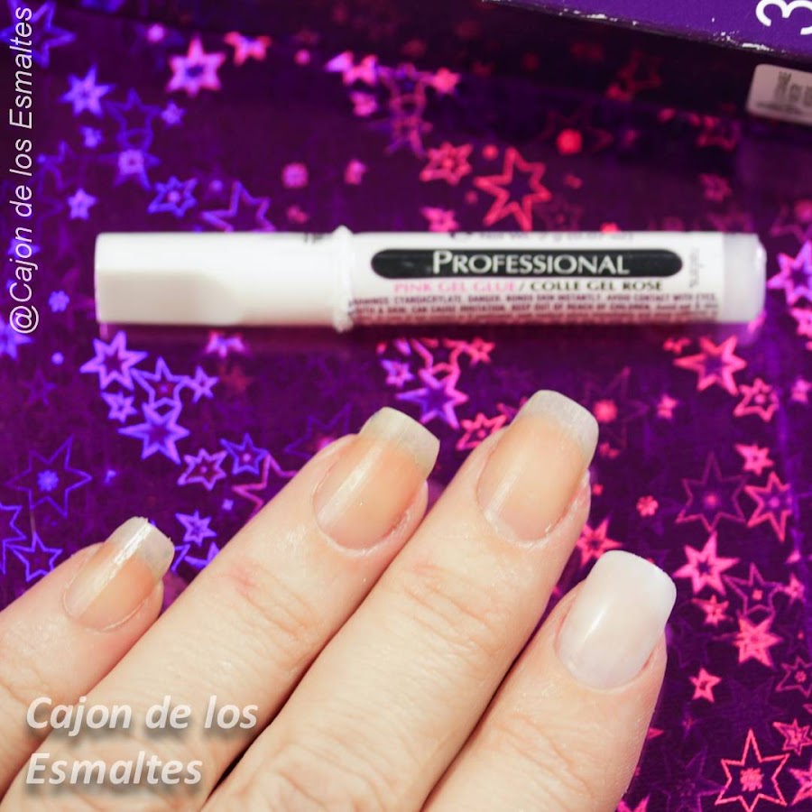 Como les decía el pegamento aguanta mucho...muchísimo, al punto que da bastante trabajo sacarlas aún después de muchos días de puesto. Para no dañar la uña jamás intenten despegarlas a fuerza o arrancando la uña postiza, se debe hacer un baño de acetona para derretir la uña postiza y el pegamento sin lastimar la nuestra.