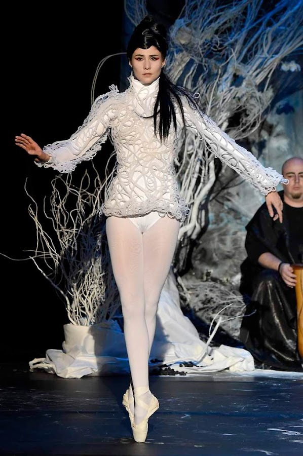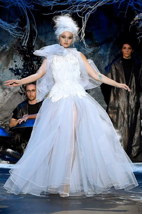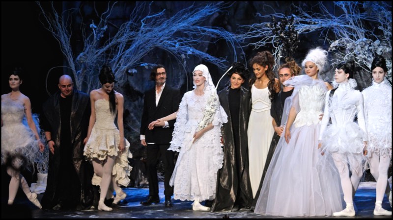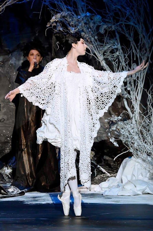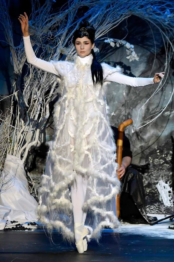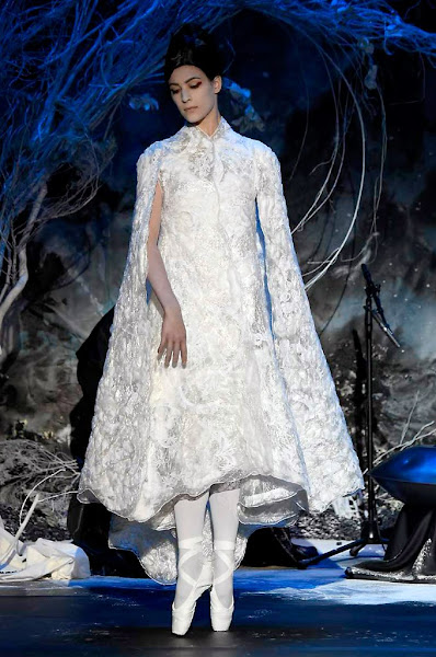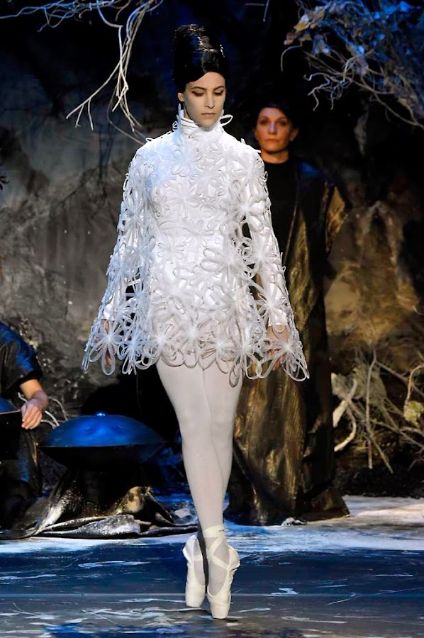 Y que mejor forma de presentarla que, transformando la pasarela, en un escenario por donde se deslizan, cual cuento de invierno etéreas bailarinas que ejecutan su danza a la vez que lucen los distintos diseños, todos de un único color el blanco, diseños superfemeninos que nos harán sentir como princesas de cuento, el desfile se realizó en el Theatre Hebertot de Paris. Comenta el diseñador a Le Figaro, que el desfile es un recuerdo conmovedor y homenaje a la bailarina rusa Maya Plisetskaya fallecida hace unos meses. Segun el diseñador " La danza clásica se adapta perfectamente a la alta costura, la danza, vestida con piezas de alta costura, es un delicado ejercicio para las bailarinas, pero que da un nuevo significado a la ropa y expone la belleza sin igual ..."