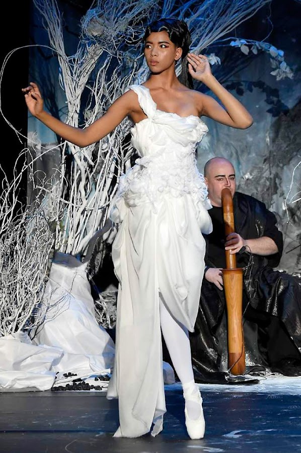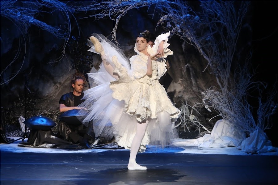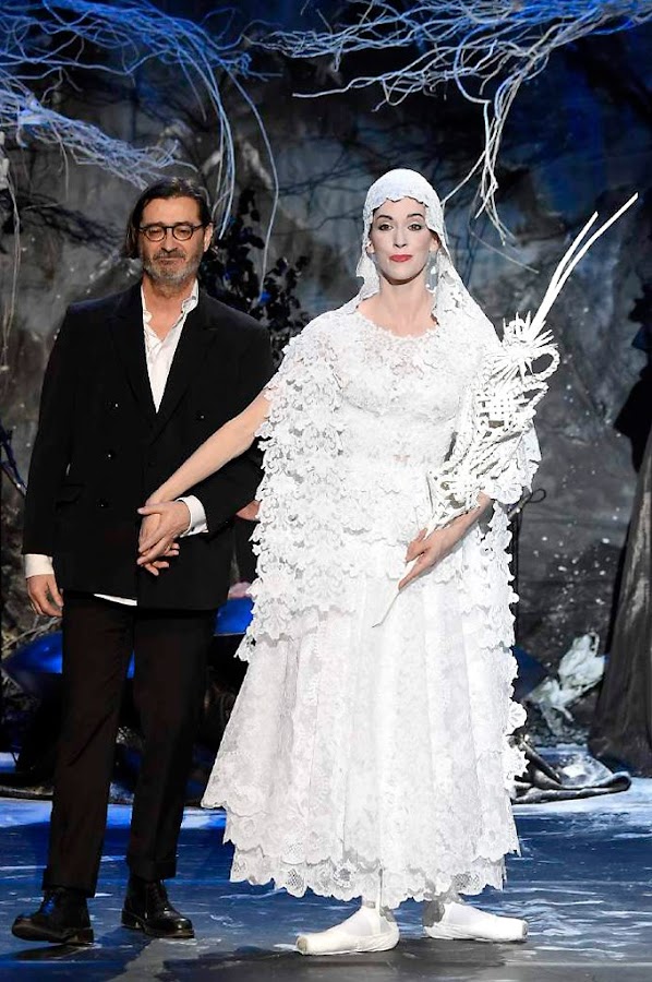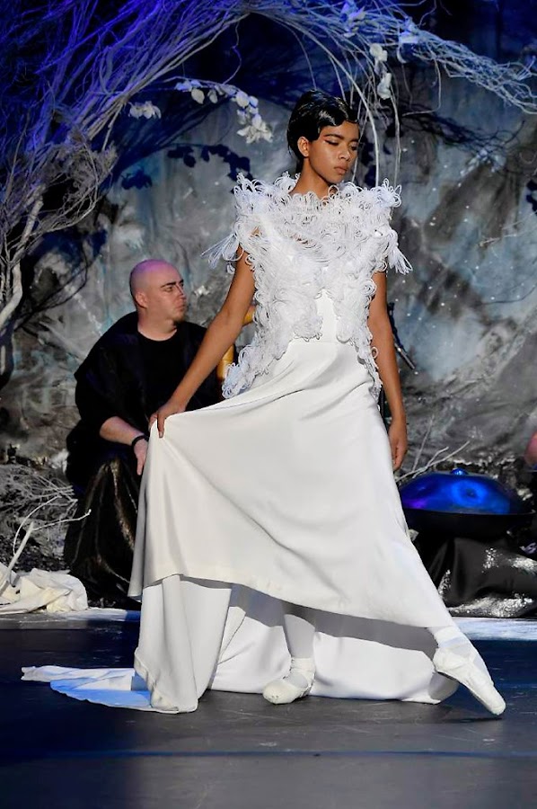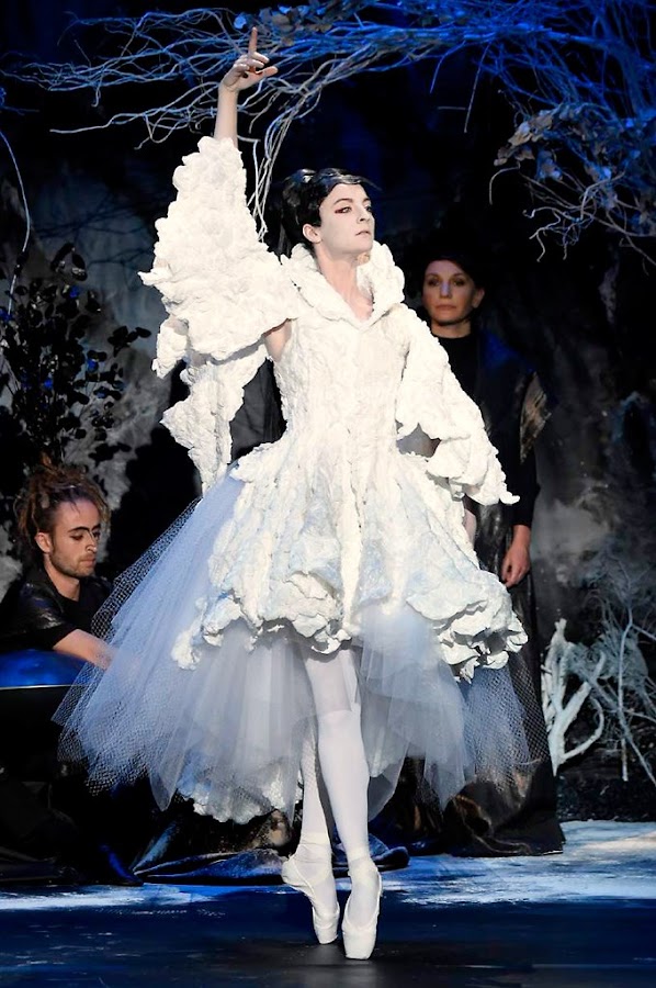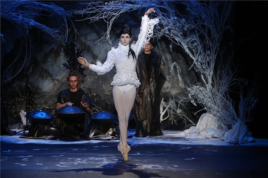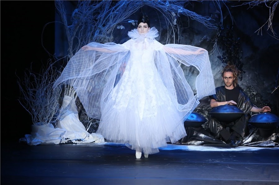 Y que mejor forma de presentarla que, transformando la pasarela, en un escenario por donde se deslizan, cual cuento de invierno etéreas bailarinas que ejecutan su danza a la vez que lucen los distintos diseños, todos de un único color el blanco, diseños superfemeninos que nos harán sentir como princesas de cuento, el desfile se realizó en el Theatre Hebertot de Paris. Comenta el diseñador a Le Figaro, que el desfile es un recuerdo conmovedor y homenaje a la bailarina rusa Maya Plisetskaya fallecida hace unos meses. Segun el diseñador " La danza clásica se adapta perfectamente a la alta costura, la danza, vestida con piezas de alta costura, es un delicado ejercicio para las bailarinas, pero que da un nuevo significado a la ropa y expone la belleza sin igual ..."