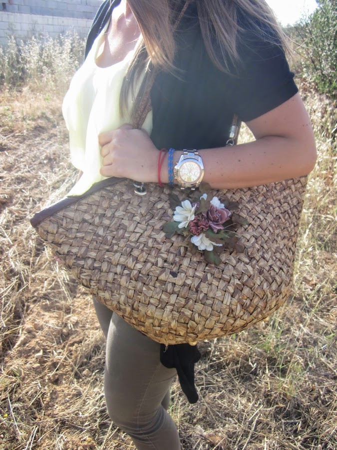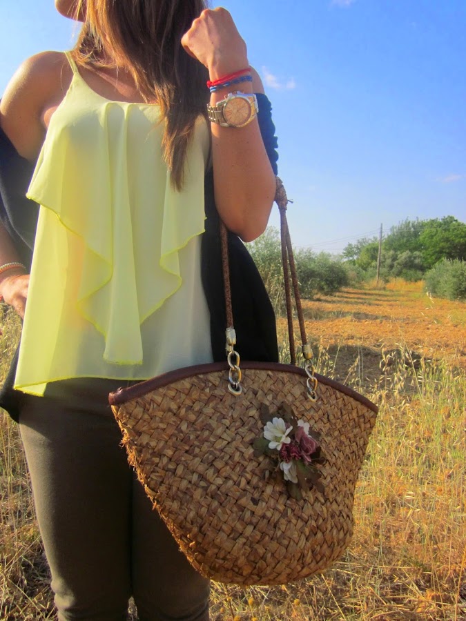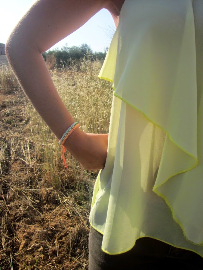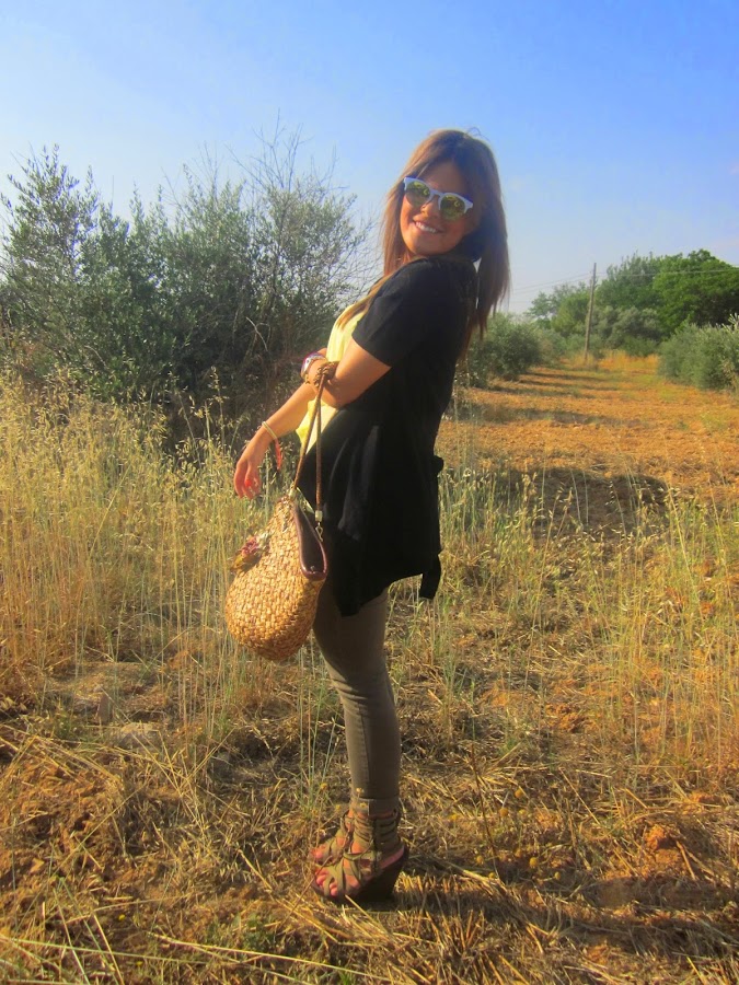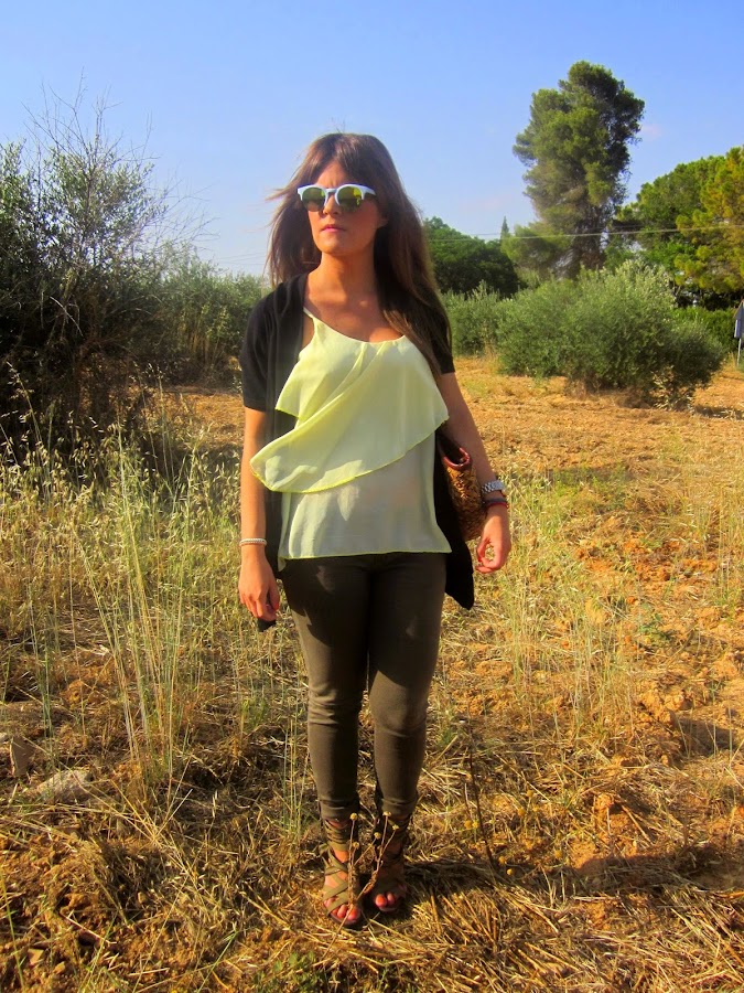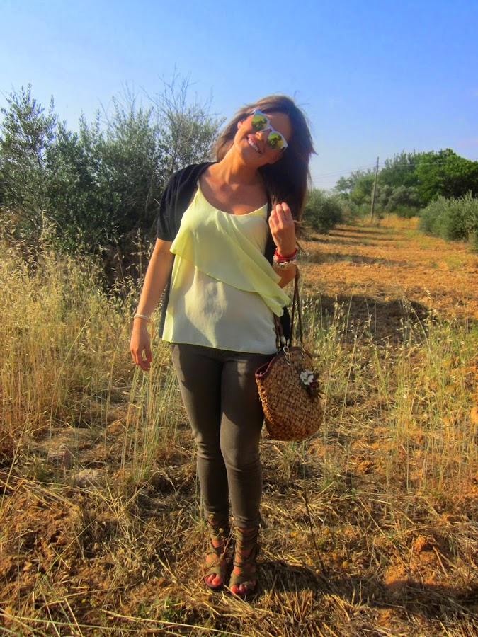 En el último look que os enseñé (puedes verlo pinchando aquí) os enseñaba una blusita de gasa en color azul cielo preciosa que os dije que se había convertido en una de mis favoritas, además os contaba que me había hecho con varias en colores diferentes porque me parecían muy ponibles. Y aquí tenéis otra de ellas, en este amarillo que tanto se lleva esta temporada y que estoy segura que quedará aún mejor cuando (porfin) pueda tomar el sol y tenga la piel mucho más bronceada de lo que la tengo ahora (que es más bien poco o nada). En el look de hoy, os enseño también mis nuevas gafas de sol, regalito de janoskisado, que me chiflan y se me ocurren mil y una posibilidades con ellas.