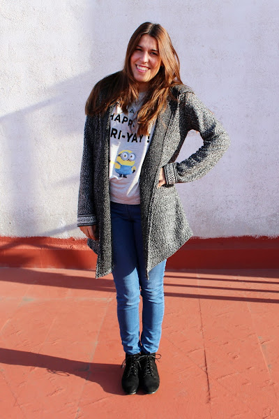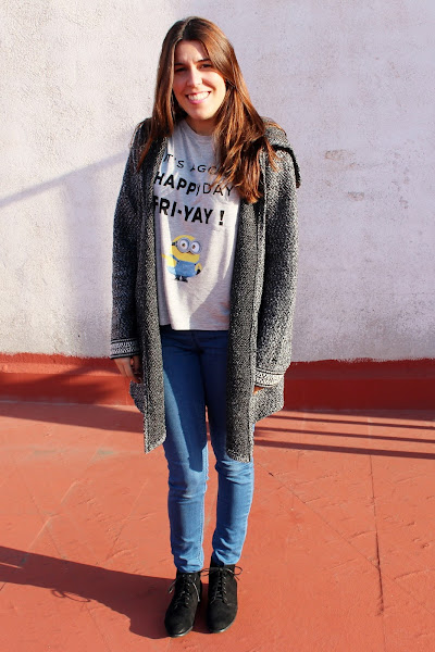 El outfit de hoy es cómodo, porque para ir a trabajar yo estoy a favor de la comodidad. La camiseta me la compré en Bershka, y es de los Minions! Y es que soy superfan de ellos, y la frase es "Its a good happy day FRI-YAY" y es camiseta para viernes haha El pantalon tejano es de H&M, los zapatos también son nuevo y son de Sfera, y la chaqueta también es nueva y es de Bershka, y lo que más me gusta es el borde que hay en la manga. Son mis autoregalos de Navidad.