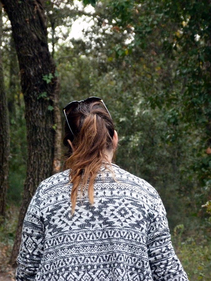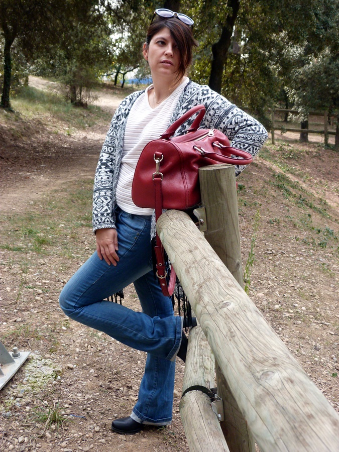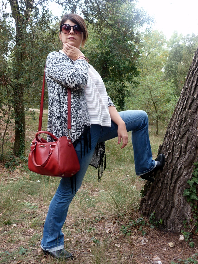 Hoy os traigo un look con una chaqueta de flecos en blanco y negro que encontré en una tienda local a la que no iba hacía años y me sorprendió gratamente, así que seguro que vuelvo por allí, en ésta ocasión la combiné con pantalones de campana, me encanta como queda la figura y como alargan la pierna y así nos fuimos a pasear al bosque, el paisaje no puede ser más otoñal, vimos hasta ardillas, lástima que no nos dio tiempo a fotografiarlas.