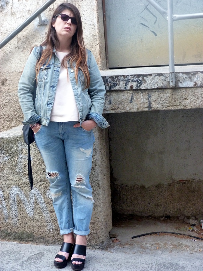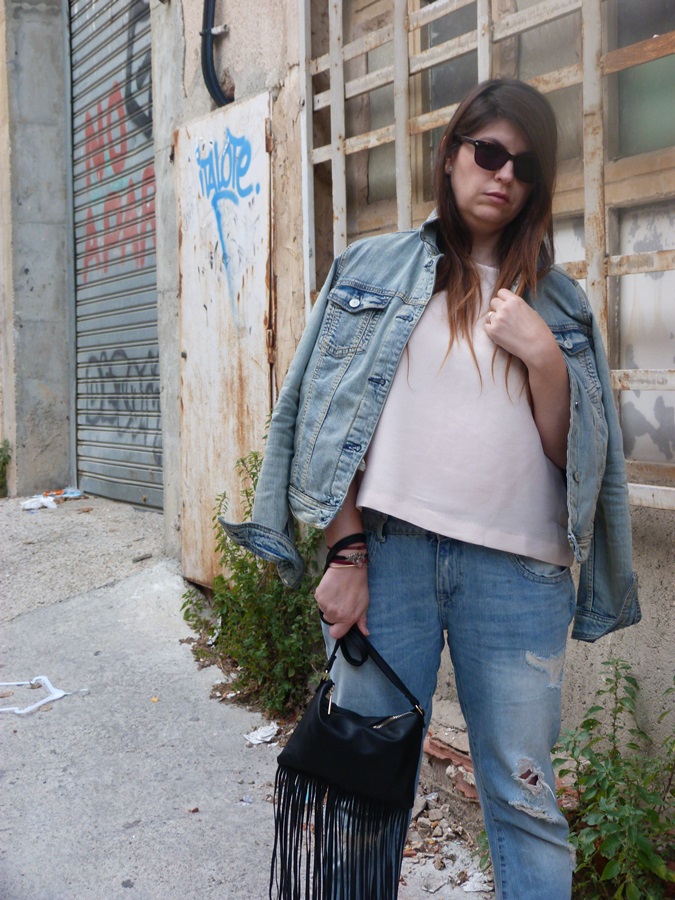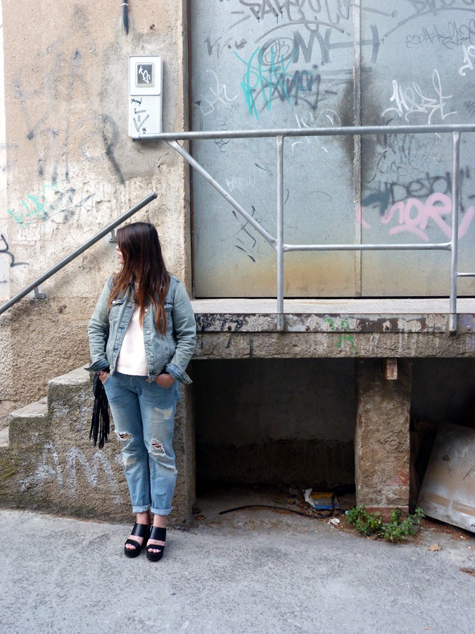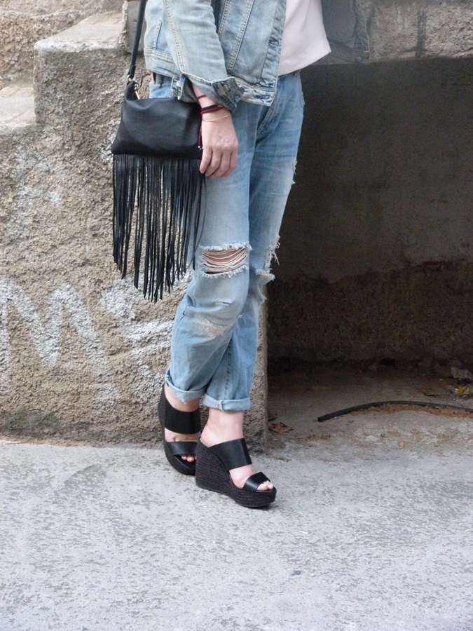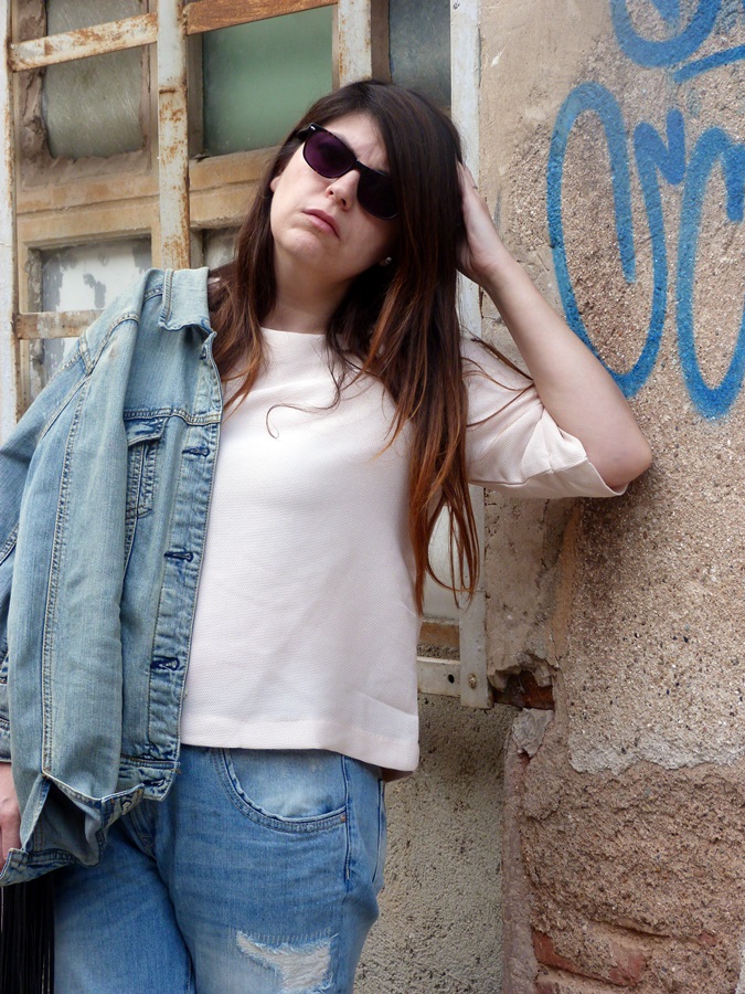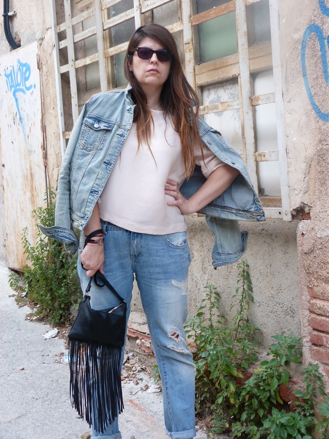 ¡¡¡Hola chic@s!!!¿Como va la semana? yo sin tiempo, preparando el shooting de moda en estudio que tengo éste domingo y mil cosas más por hacer, hoy por fin he podido publicar, el fin de semana estuve en otro mercado, ésta vez en Sants, el día fue súper caluroso pero productivo, ¿como habéis pasado el fin de semana? últimamente mis looks son bastante cómodos y en tejanos y el de hoy es uno de ellos, ésta vez saqué del armario mis pantalones boyfriend y los combiné con un top rosa de Mango que me tiene enamorada, le veo muchísimas posibilidades, tiene una manga corta pero más larga de lo normal que es muy adecuada para éste tiempo, su tejido grabado y su corte amplio lo hacen una pieza super cómoda y estilosa, como complementos elegí bolso de flecos en negro y mis nuevas cuñas de rafia de Zara súper altas pero súper cómodas! El lugar elegido para el shooting no me pudo gustar más para éste look lleno de contrastes en entorno industrial, que encontramos por casualidad huyendo de las miradas ;)