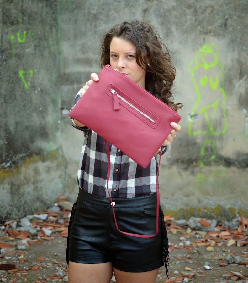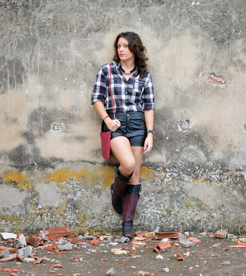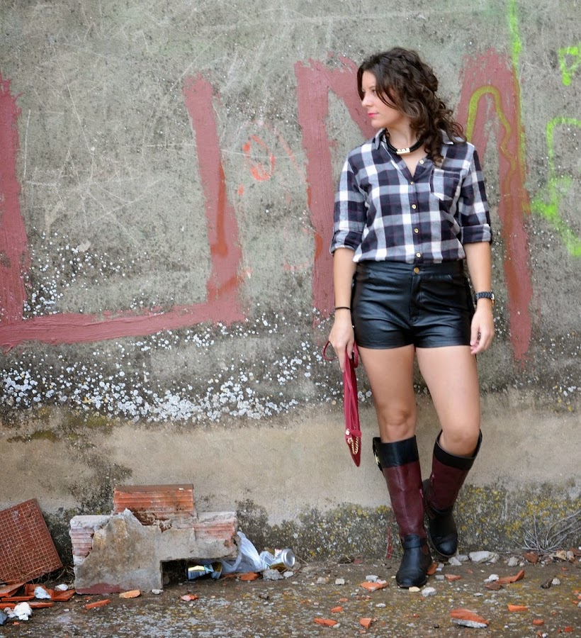 Con estos shorts se pueden hacer infinidad de looks, ya los iréis viendo. De momento y como el tiempo nos sigue acompañando puedo arriesgarme a llevar medias claras y camisas de manga francesa. opté por una camisa de cuadros en tonos grisaceos y con rallas muy difuminadas en tonos burdeos. Como complementos elegí un cluth en burdeos y las botas altas combinadas que ya me las habías visto en otro look.