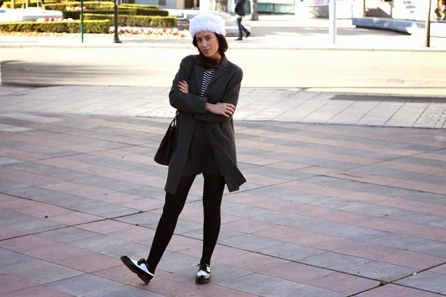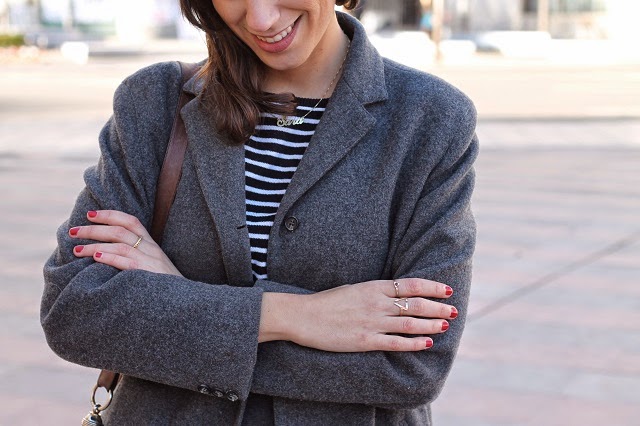 Jersey marinero, falda con vuelo gris, abrigo clásico y mis zapatos preferidos.