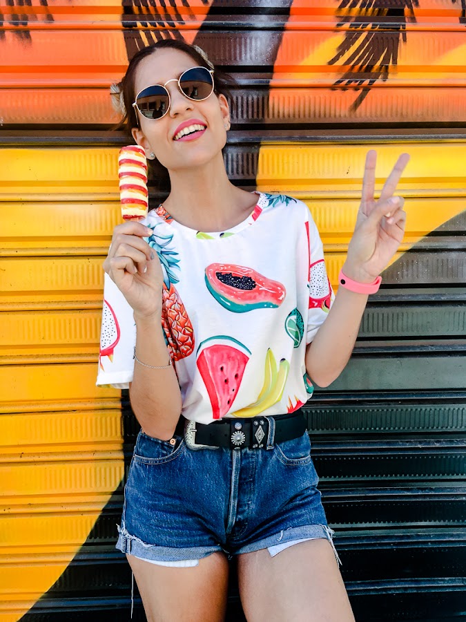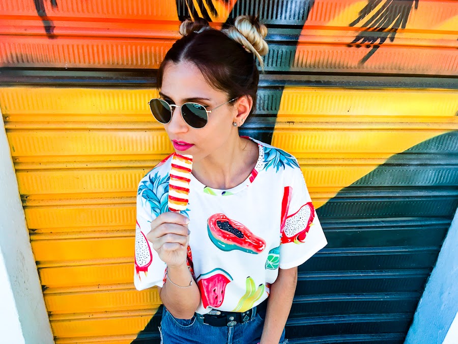Pero ya sabéis cuaaaanto os quiero y por eso, ni aún así os abandono y aquí os traigo un nuevo post con el look que llevé esta tarde. Un look muy divertido con una camiseta de estampado de frutas de SHEIN. Es súper cómoda y que no te engañen sus mangas cortas porque es súper fresquita!!