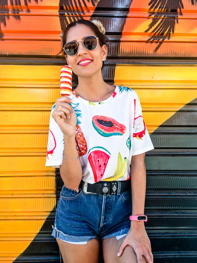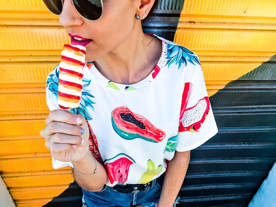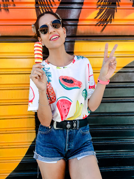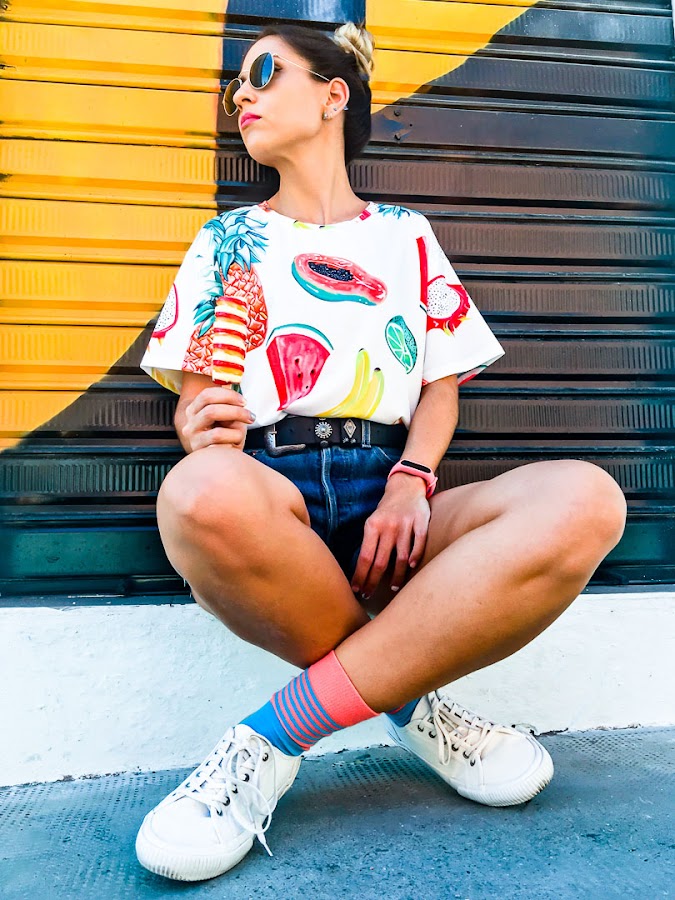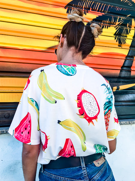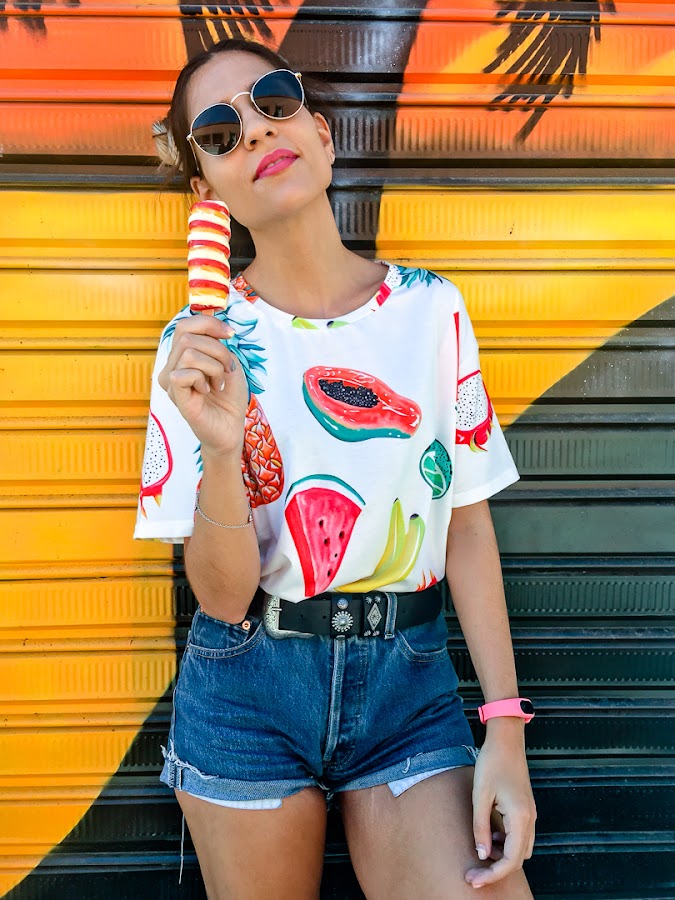 Pero ya sabéis cuaaaanto os quiero y por eso, ni aún así os abandono y aquí os traigo un nuevo post con el look que llevé esta tarde. Un look muy divertido con una camiseta de estampado de frutas de SHEIN. Es súper cómoda y que no te engañen sus mangas cortas porque es súper fresquita!!