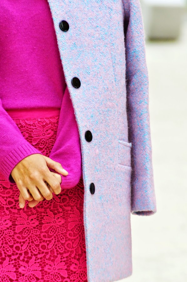 Lavender coat / Silver heels: Bershka / Lace skirt: Cacharel / Sweater: H&M