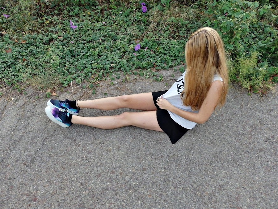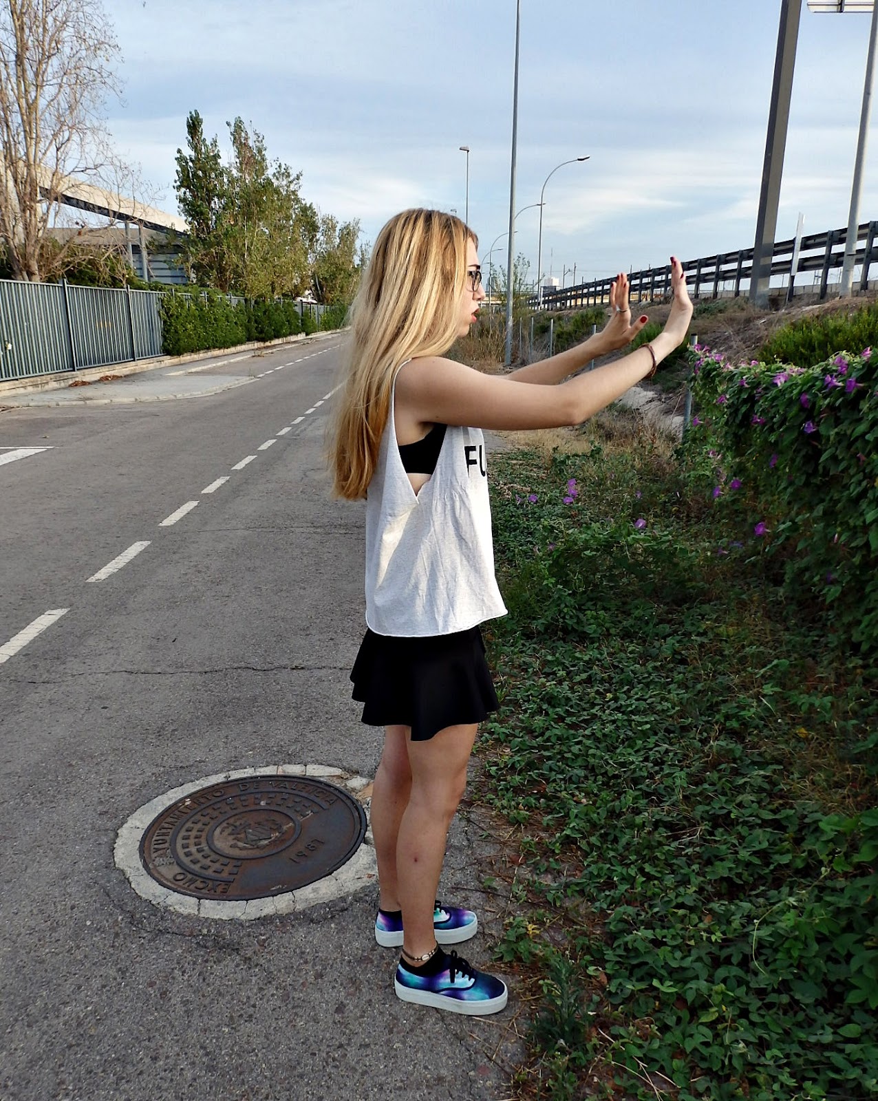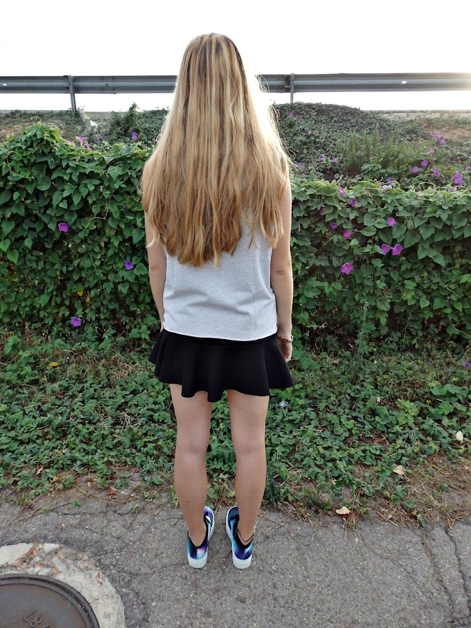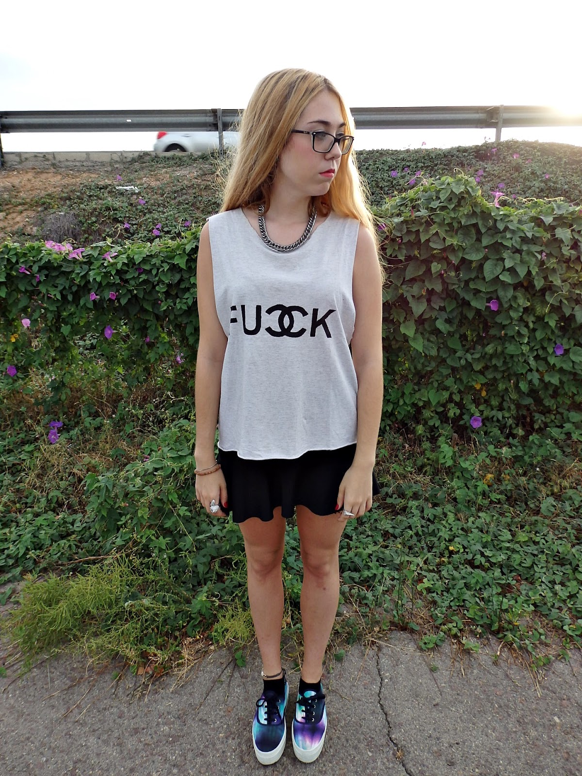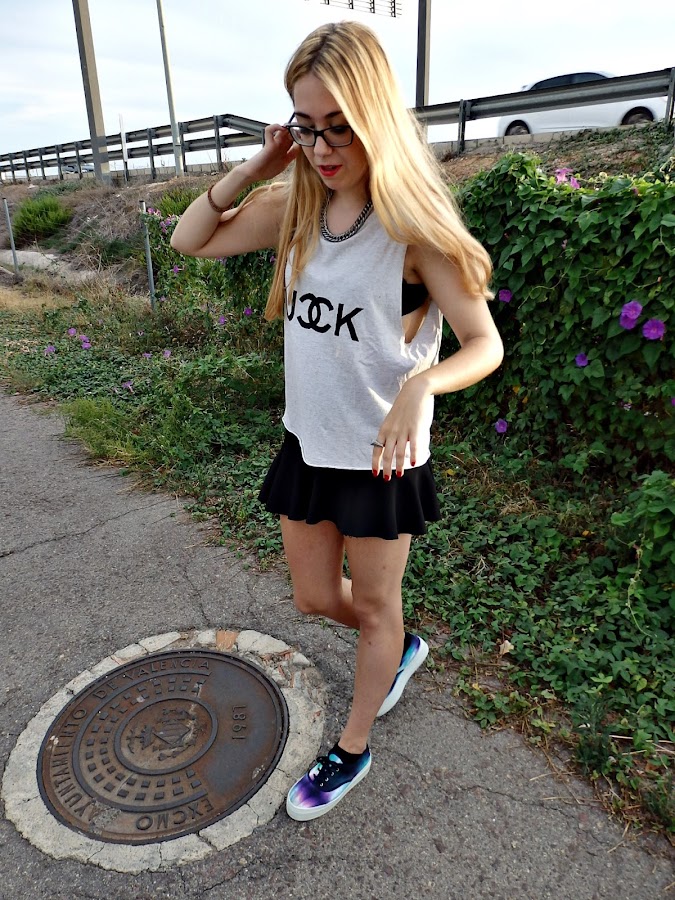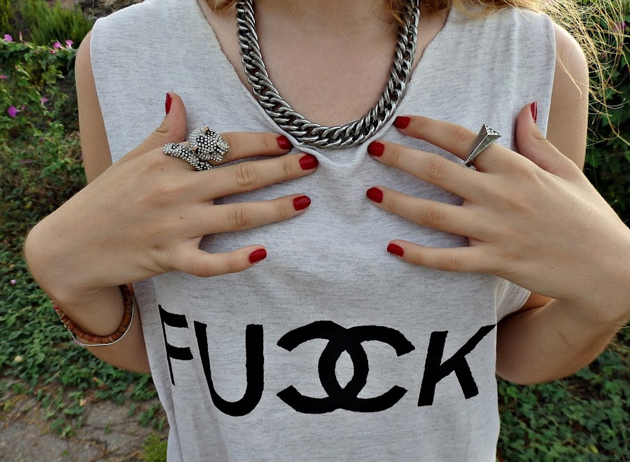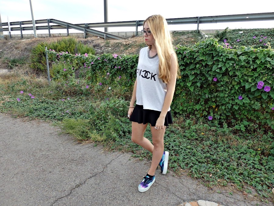 Hoy os traigo un outfit que a mi personalmente me encanta, ya que creo que tiene un toque muy original. Una de las prendas principales es la camiseta, es un DIY que hice yo misma el verano pasado y que está basado en una camiseta de Chanel; para la parte de abajo he elegido esta falda pep-hem que ya os hablé y enseñé en un post (TOTAL LOOK) y como zapatos estas zapatillas de plataforma que también os enseñé en una entrada (PLATFORM SHOES.). En cuanto a accesorios, llevo un collar cadena y dos anillos con detalles de brillantes que creo que contrastan muy bien con el estilo informal del look. El granate de las uñas junto a los colores de las zapatillas también le dan un toque de color al outfit.