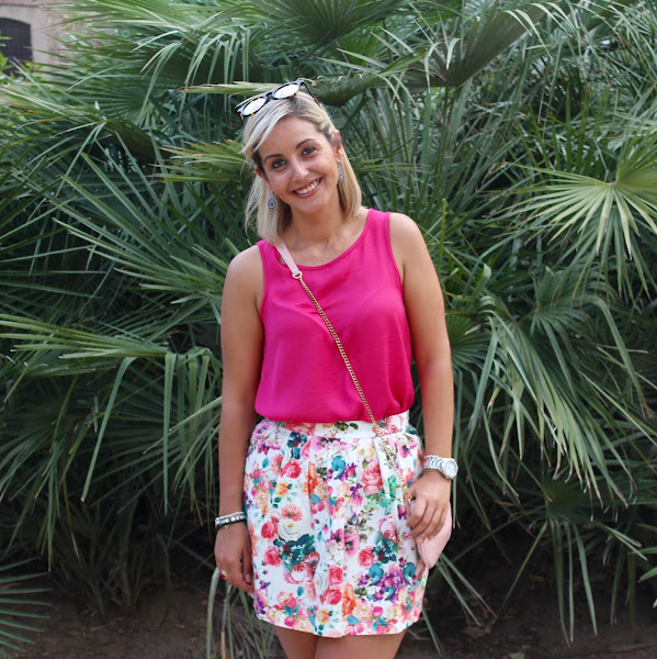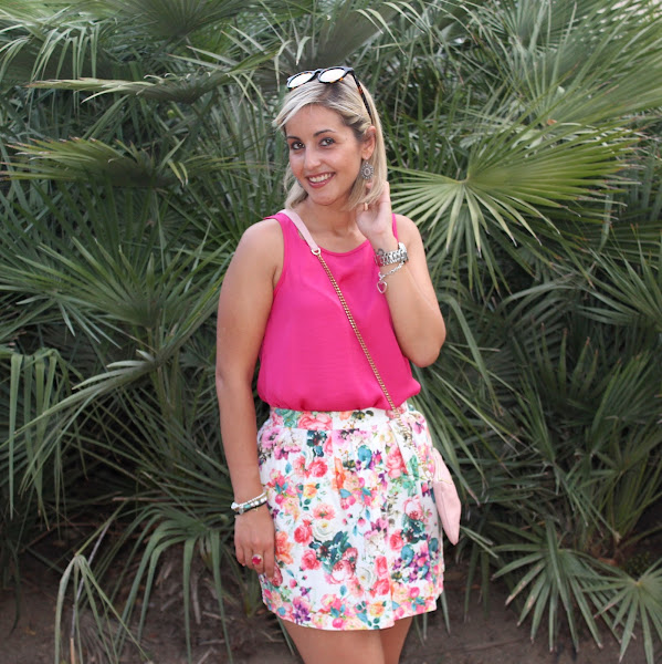 Hoy os enseño un look con mucho color, porque el verano es para llevar colores vivos que den alegría a nuestros looks. En el look de hoy, llevo un top en color fucsia que combiné con una falda de flores. Los accesorios que escogí para el look fueron en colores neutros para centrar la atención en el look como las sandalias en color camely el bolsito en tono rosa.