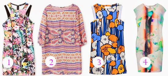 ¡Vestidos coloridos!, ¡me encantan!. De estos cuatro, mi favorito es el (3), de Zara.