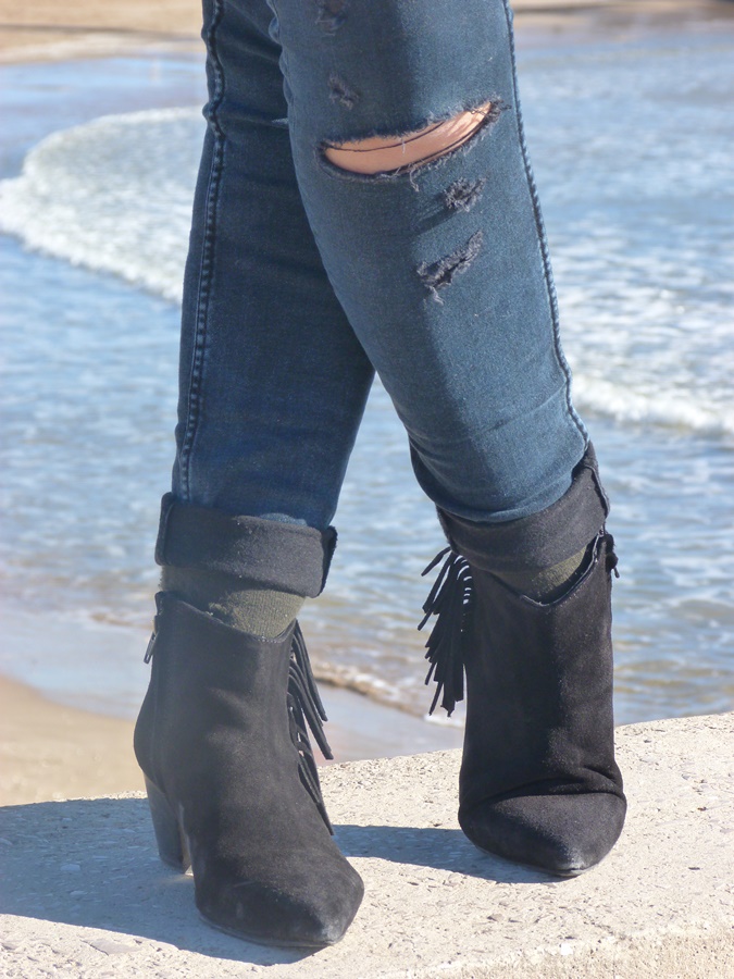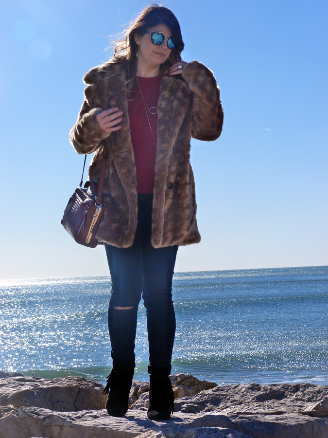 Ahora os hablaré sobre el look de hoy, éste invierno me hice con un abrigo de pelo en camel super cálido y en ésta ocasión lo acompañé de top rojo de Zara con manga acampanada y pantalones con apertura en la rodilla, las fotos están tomadas en el maravilloso pueblo costero de Sitges, en la playa, espero que os guste.