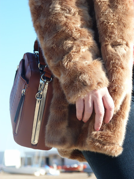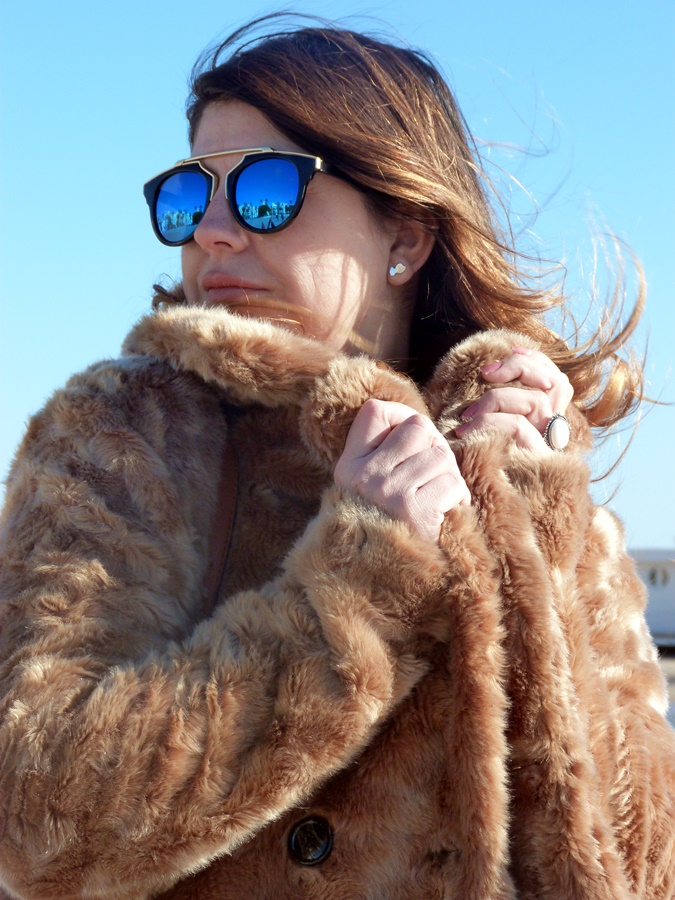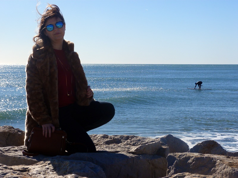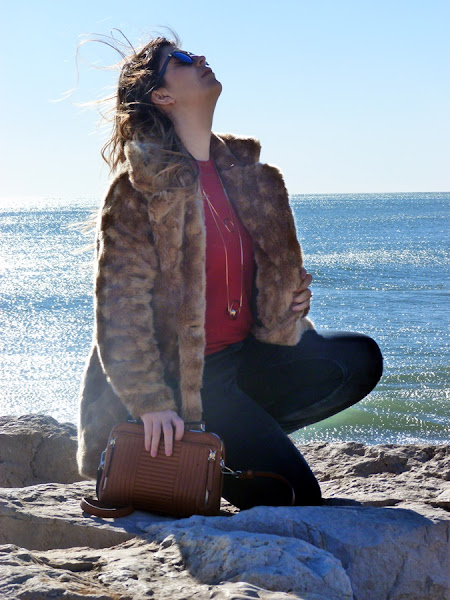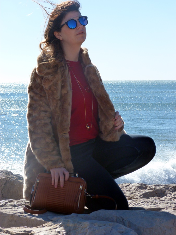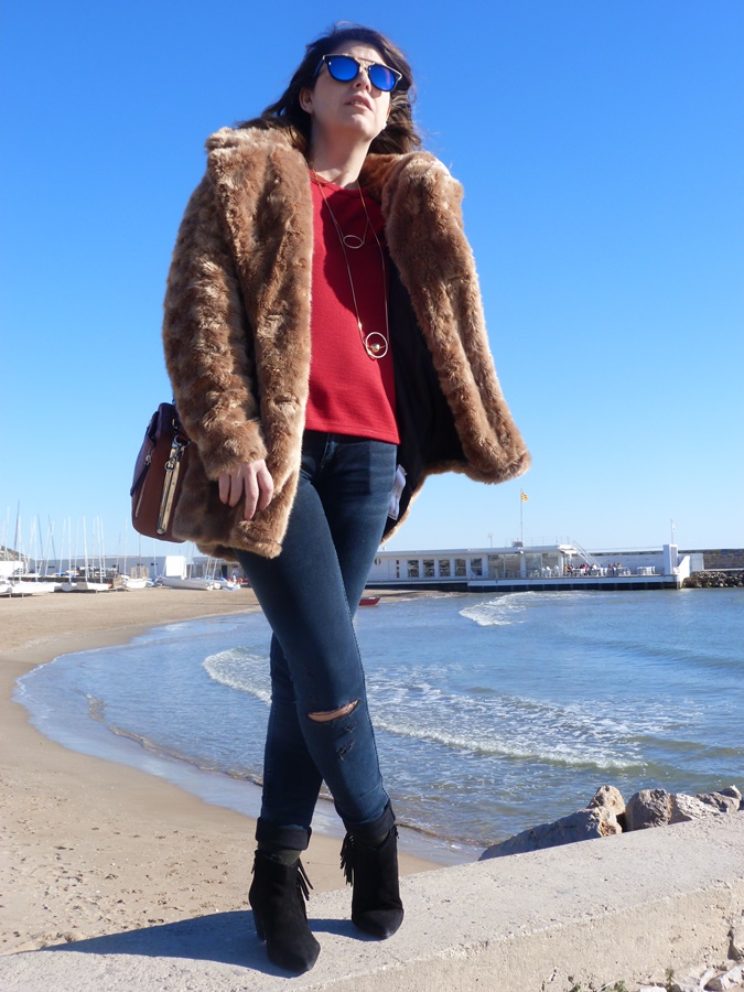 Ahora os hablaré sobre el look de hoy, éste invierno me hice con un abrigo de pelo en camel super cálido y en ésta ocasión lo acompañé de top rojo de Zara con manga acampanada y pantalones con apertura en la rodilla, las fotos están tomadas en el maravilloso pueblo costero de Sitges, en la playa, espero que os guste.