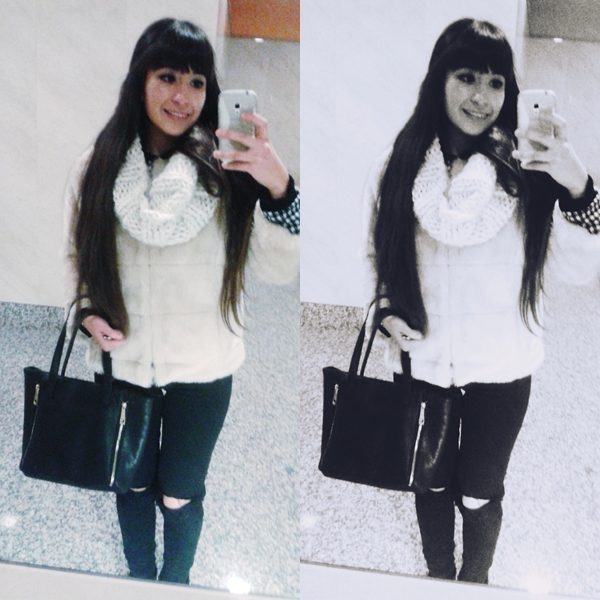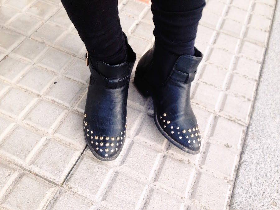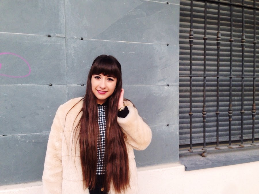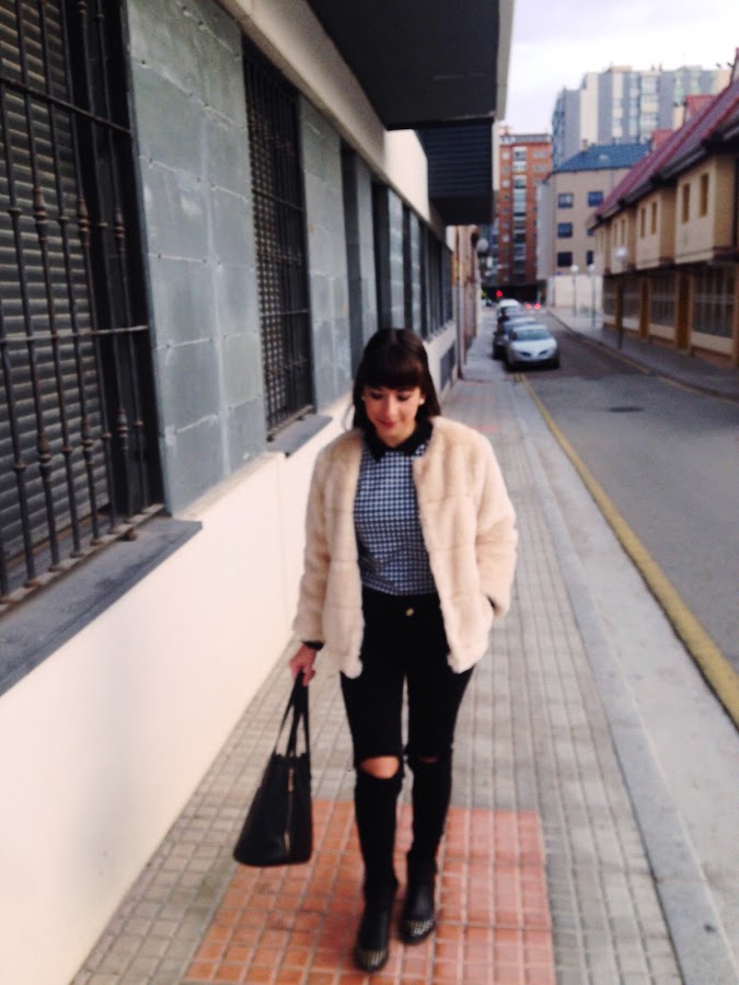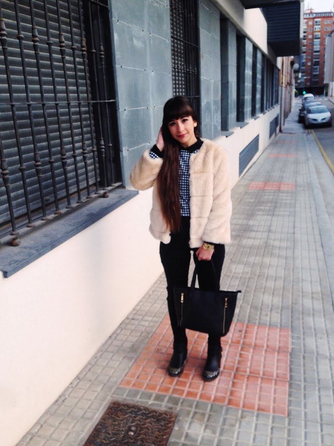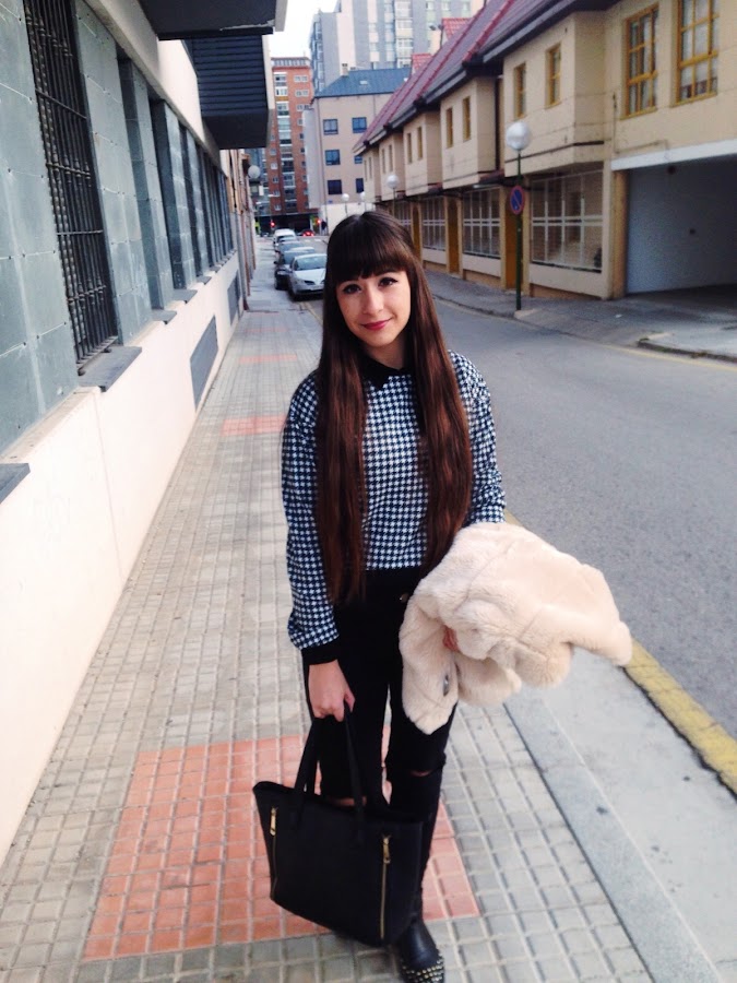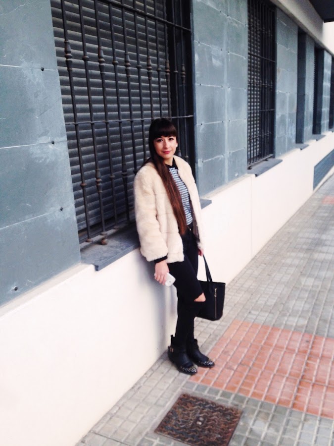 Lo combino con un jersey de tweed cortito, ripped jeans, botines con tachuelas y mi bolso básico negro. Creo que es una combinación bastante formal y arreglada para días de Invierno en los que no queremos pasar frió y ir arregladas. Espero que os guste y perdón por la calidad de algunas de las fotos :)