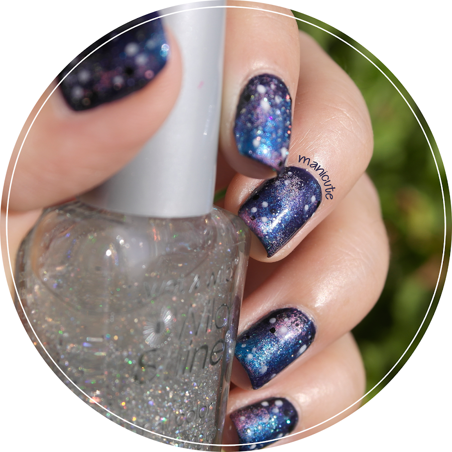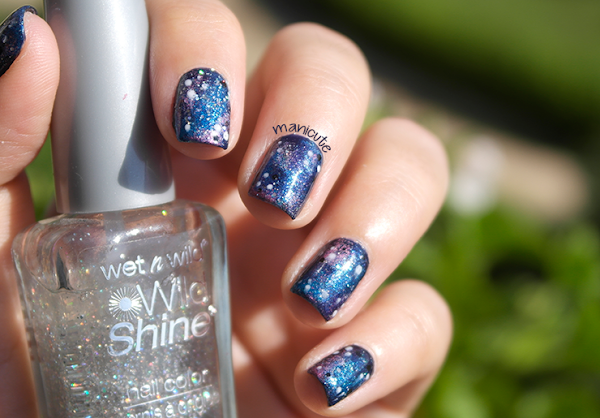 Por último, y es algo en lo que "innové", di una capa de purpurina fina y holográfica. Me parece que le da un toque aún más brillante a lal manicura, ayuda a recordar todavía más las estrellitas, ¿no os parece? Utilicé este top coat tan apañado de wet n wild. Si queréis seguir mi consejo, intentad no coger mucha purpurina porque solo queremos darle un toque a nuestro nail art, ¡¡tampoco tiene que parecer una verbena de feria!!