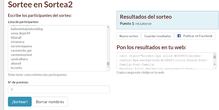 Aquí se que había dos nombre repetidos, así que no penséis que esas chicas tenían participación doble. Aviso por si luego hay quejas, que si me he dado cuenta, ya que no me dejaba sacar ganadora y me vino genial la página porque me digo que nombres estaban repetidos y todo.