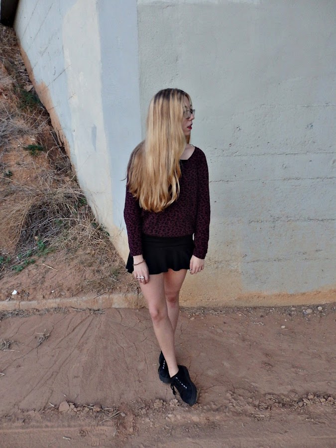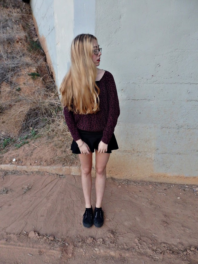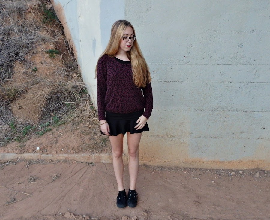 En Valencia sigue sin aparecer el frío, de ahí el outfit de hoy, compuesto por la falda pep-hem que ya os he enseñado y un suéter con estampado animal print de leopardo. Me gusta mucho el resultado ya que creo que ambas piezas congenian perfectamente creando un outfit otoñal y original. En cuanto a calzado he optado por estas zapatillas negras de plataforma que hacen que se cree un total look en negro destacando el suéter con animal print. Como accesorios solo llevo un anillo doble color oro viejo y en las uñas un color verde militar y negro, todas las tonalidades perfectas para el otoño.