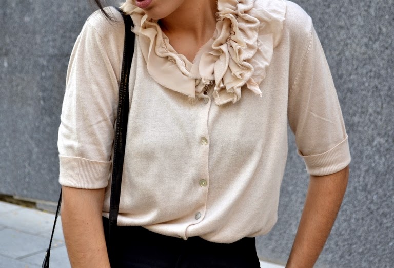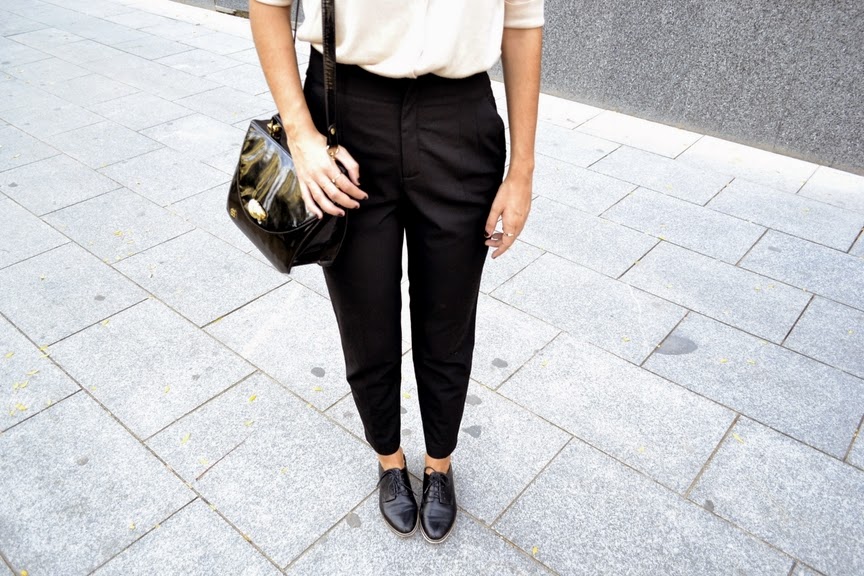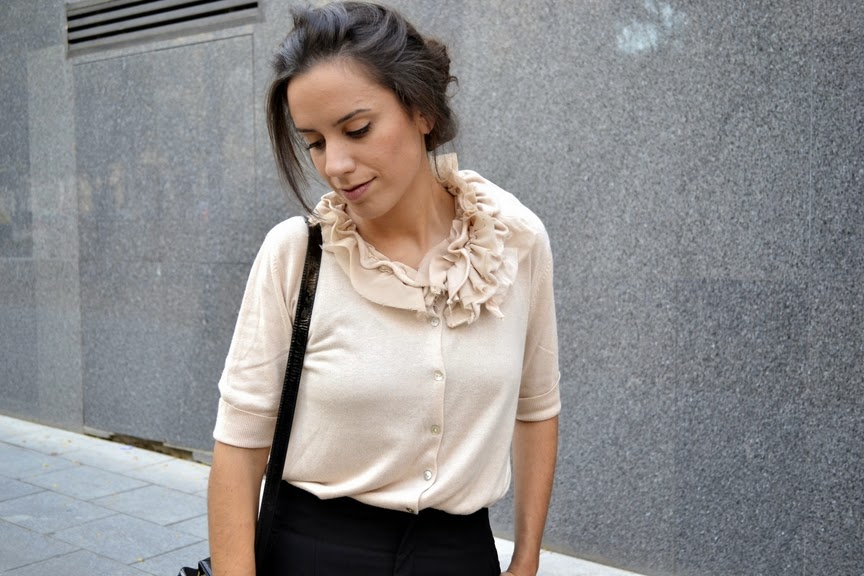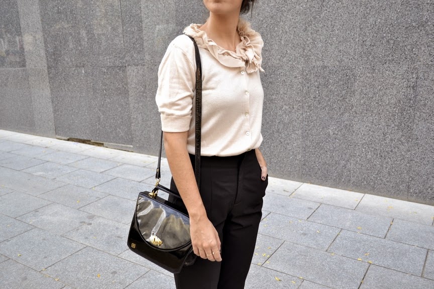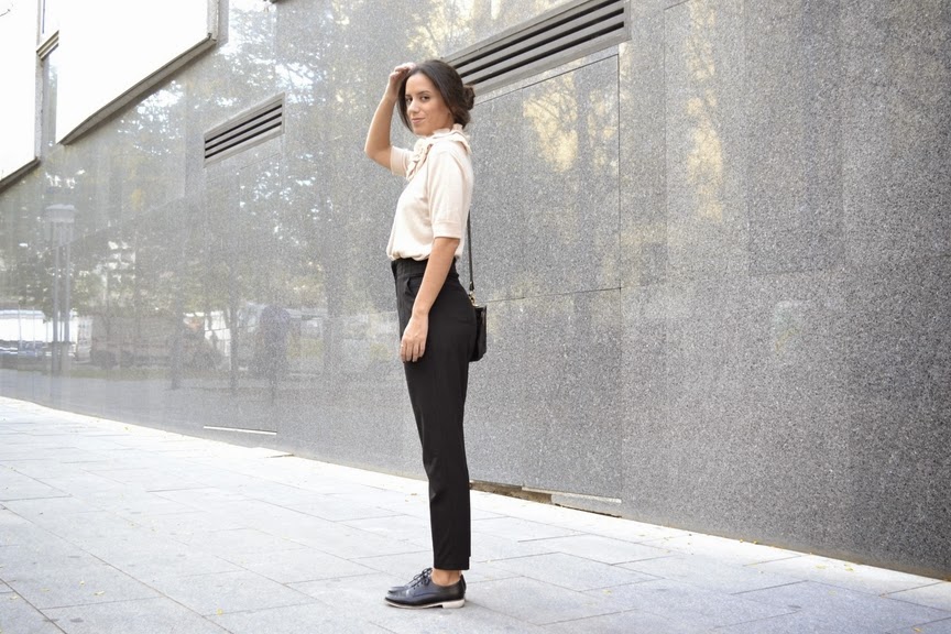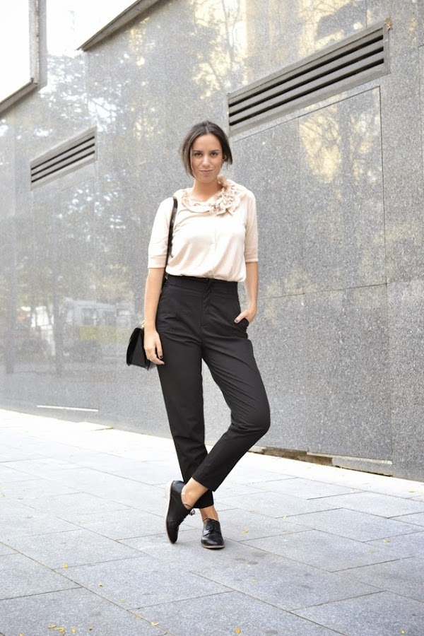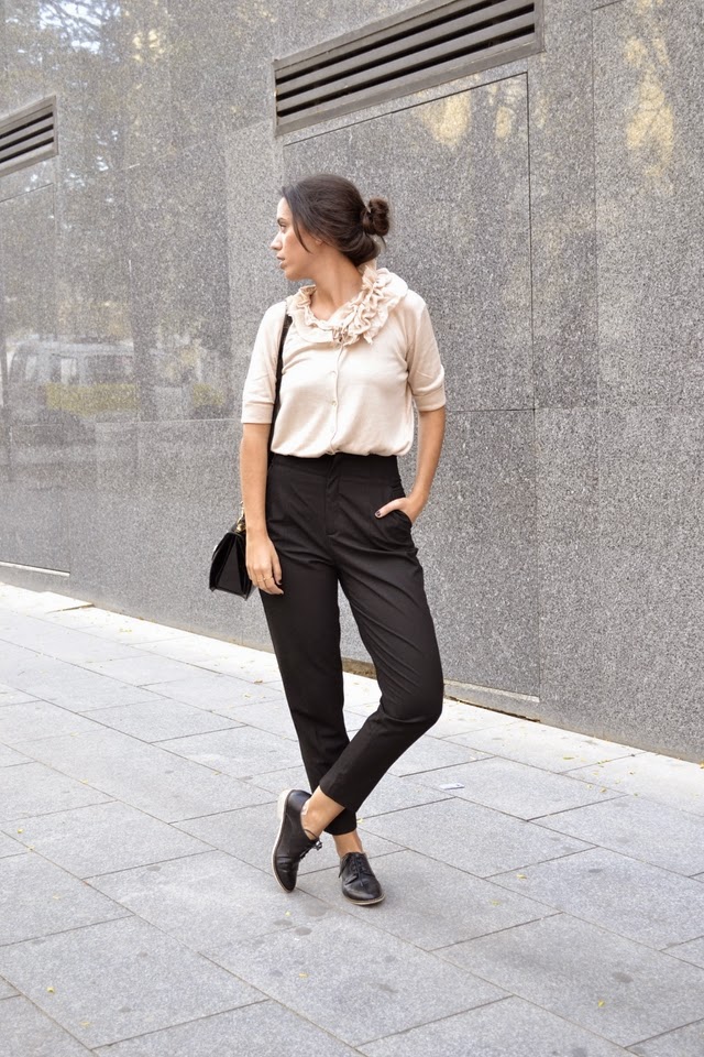 Estos pantalones desde que me los compré se volvieron un fondo de armario. Me han salvado de fiestas, noches diferentes y días de diarios. Tiene ese toque masculino elegante pero a la vez femenino. Lo combiné con zapato tipo bluscher negro. Para contrarrestar tanto estilo garçon, una rebequita rosa empolvado. Con este look asistí la semana pasada a una conferencia sobre el universo Chanel en El Corte Inglés de Badajoz, en el próximo post os cuento los detalles que seguro os encantarán.