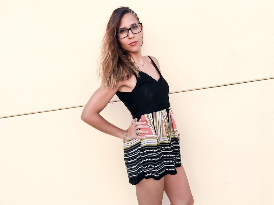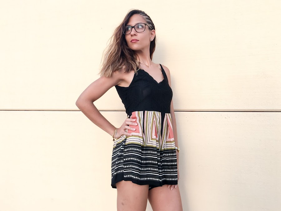 Today I show one of the rompers that have fallen in love this summer. Im a big fan of the rompers as you know, I seem super comfortable. This romper deceives a little and at first glance looks like a dress, but no, its a romper! The top is black lace and the bottom has a geometric pattern. The back is V neckline and closes with a zipper.