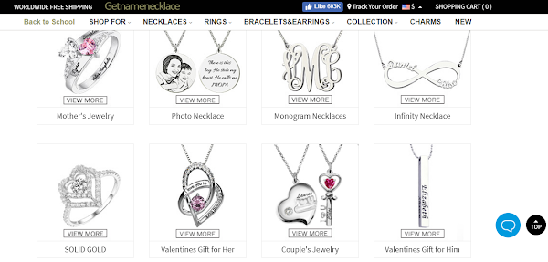 Get name necklace is an online shop with huge variety of pendants and necklace. We can shop rings, earrings and bracelets, too. The relation quality-price is so good and is free shipping. Also the page have a Jewelry Maintenance Guide and a Jewelry Sizing Guide.