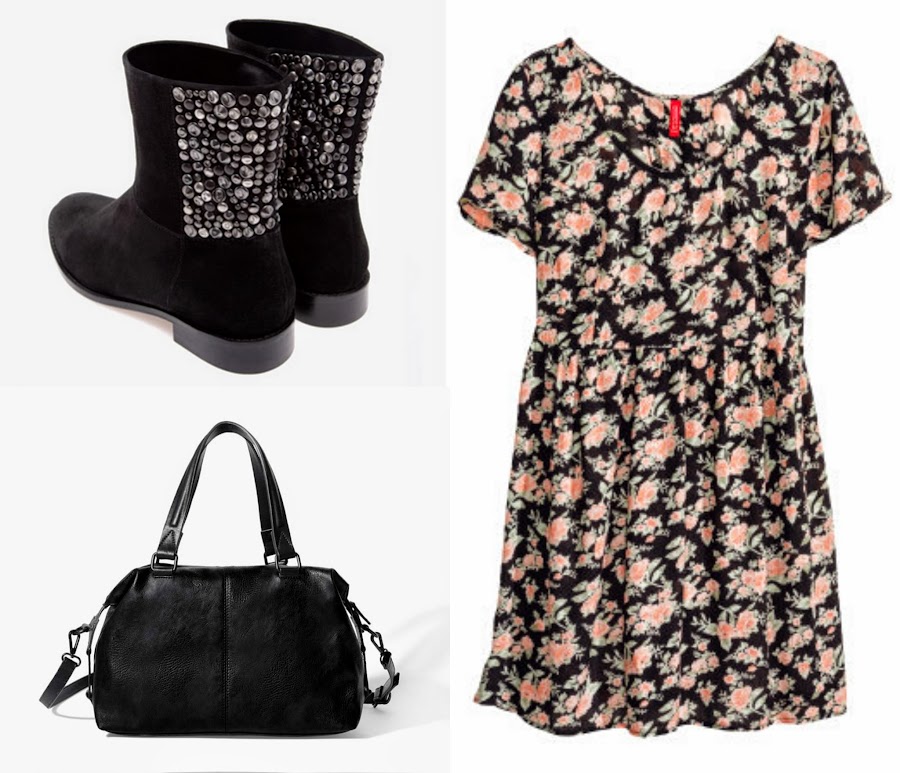 Today"s look brings a lot of flowers on a black background. Miranda Kerr, Street Style Queen, combines her stamped naïf dress with leather accessories for a ride around the city. Cowgirl booties from Isabel Marant, cut out dress from Topshop and Antigona bag from Givechy.
