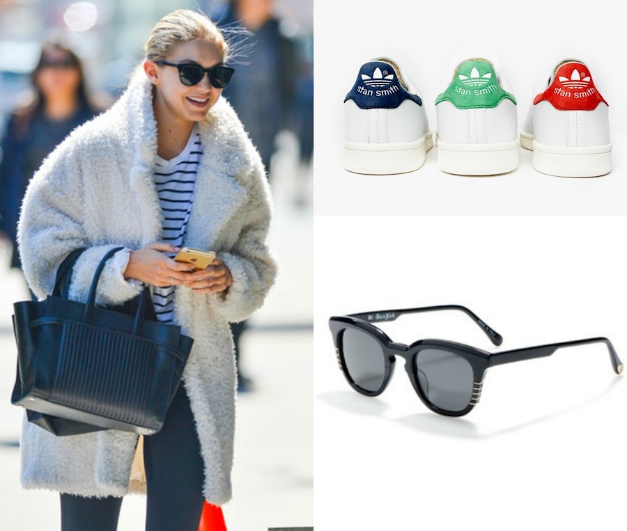 Today I propose you a new look based on celebrities style. This time, we are going to focused on Gigi Hadid and her comfy and trendy outfit, which a like a lot! She is wearing Zadig&Voltaire Bag, Adidas Stan Smith sneakers, Gerard Darel coat and III.I Optics sunglasses with jeans and striped T-shirt, which are a must.