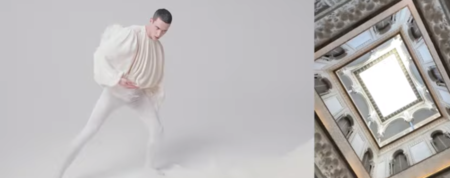 Y quien mejor para interactuar con esas majestuosas modelos que un bailarín etéreo que ejerce con sus gráciles movimientos de una especie de maestro de ceremonias, se trata del bailarín y modelo Labbat Georges que se mueve a un ritmo de violines, palmas y cajones un sonido muy de Sevilla.