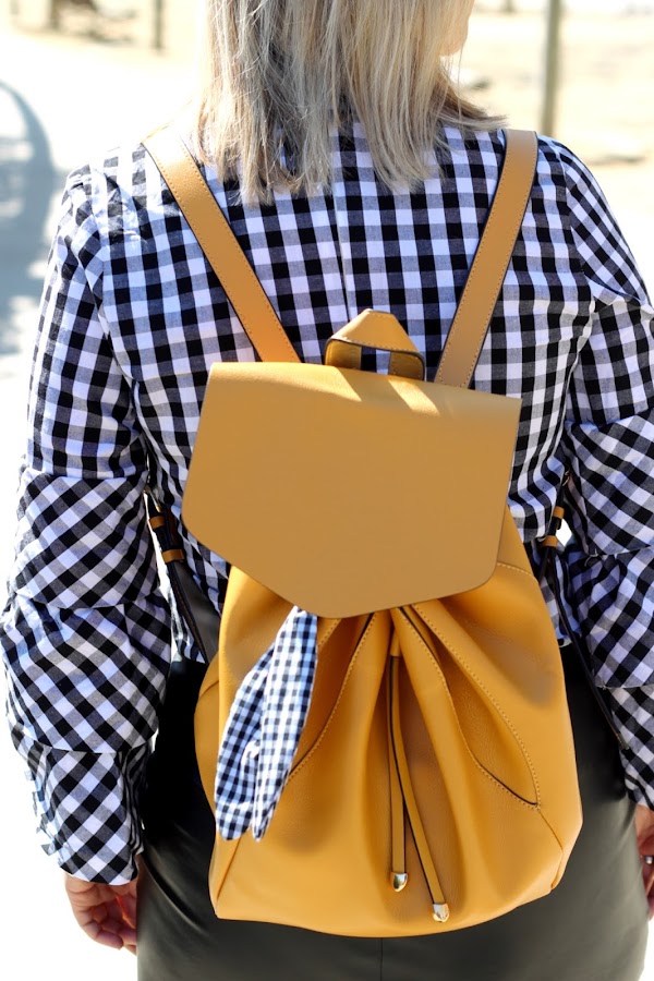 Hoy os enseño un look con una camisa de Sammydress que incorpora estas dos tendencias. Por un lado es una camisa con cuadros vichy, pero sin embargo lo que más me gustó, fueron sus mangas con volantes, que le dan un toque diferente a una simple camisa. La combiné con una falda de piel negra, unos botines negros y mi nueva mochila amarilla que le da un toque de color a este look en blanco y negro.