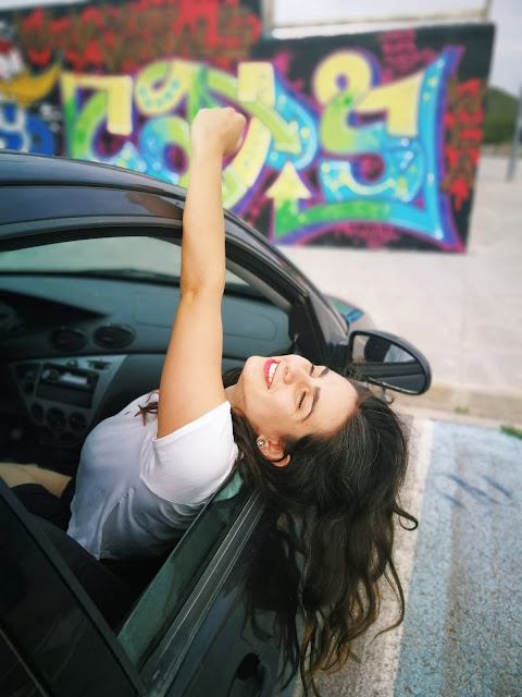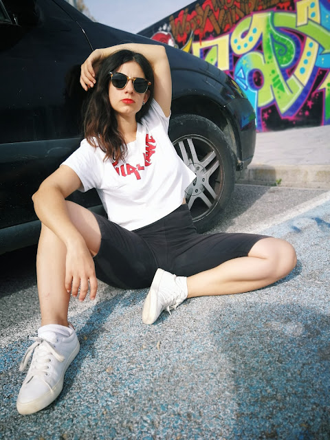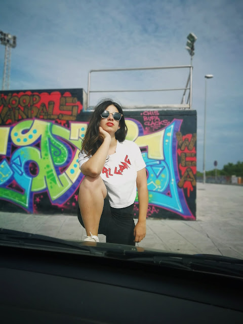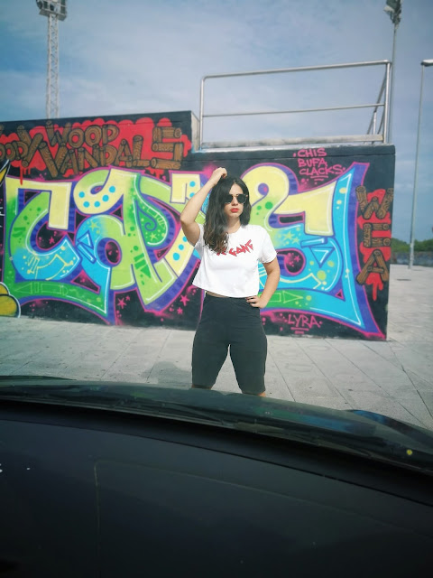 Buenos días y feliz semana. Ya la última de este mes de enero, qué rápido se me está pasando. Hoy os quería enseñar una sesión de fotos que hice en verano con una amiga y que la disfruté muchísimo. Nos lo pasamos tan bien, no sabéis lo divertida que fue. La idea principal de la sesión fue darle un toque urbano con los graffitis y con el coche. Como look, usamos prendas un poco anchas y de estilo deportivo. En mi caso, elegí un top con logo, unos leggins negros estilo ciclista y unas deportivas.