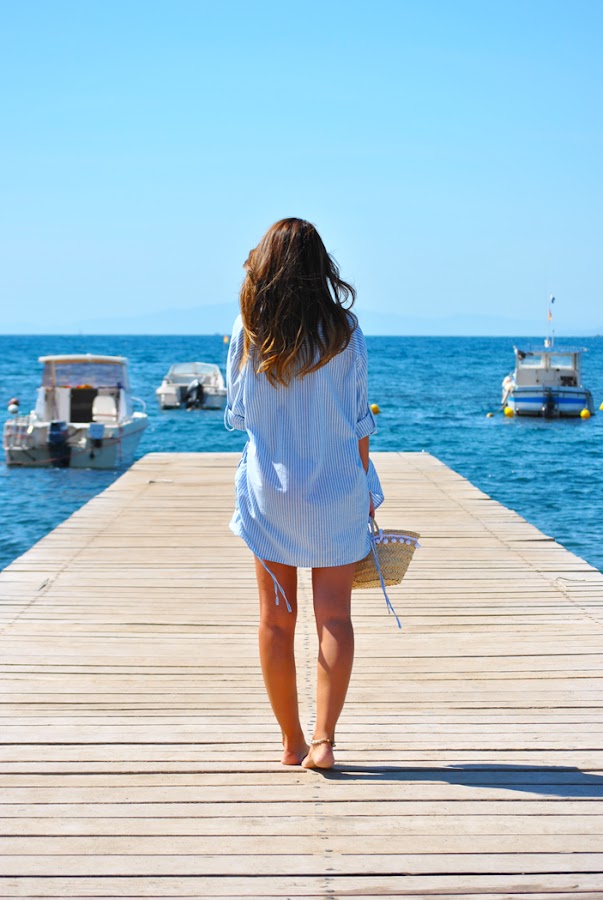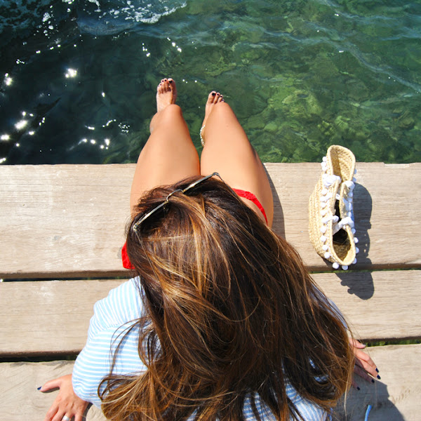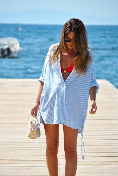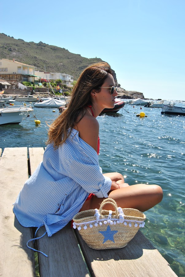 ¡Hola chic@s! Os escribo desde FORMENTERA y es que este año hemos tenido las vacaciones en en septiembre, algo fuera de lo habitual, se han hecho de rogar.... el verano en la ciudad ha sido un poco duro pero ya llegó nuestro tiempo de descanso. La primera semana hemos estado en casa de mis padres del pueblo, las fotos son de allí, de la playa de Calabardina... allí el verano todavía no se ha acabado!! Para disfrutar de un día playero elegí camisa de rayas azules abrochada con un único botón y bikini rojo de Calzedonia regalito de mi cumple y como complemento mini capazo "handmade" (el detalle de boda para las chicas, yo también me hice el mío jejeje)