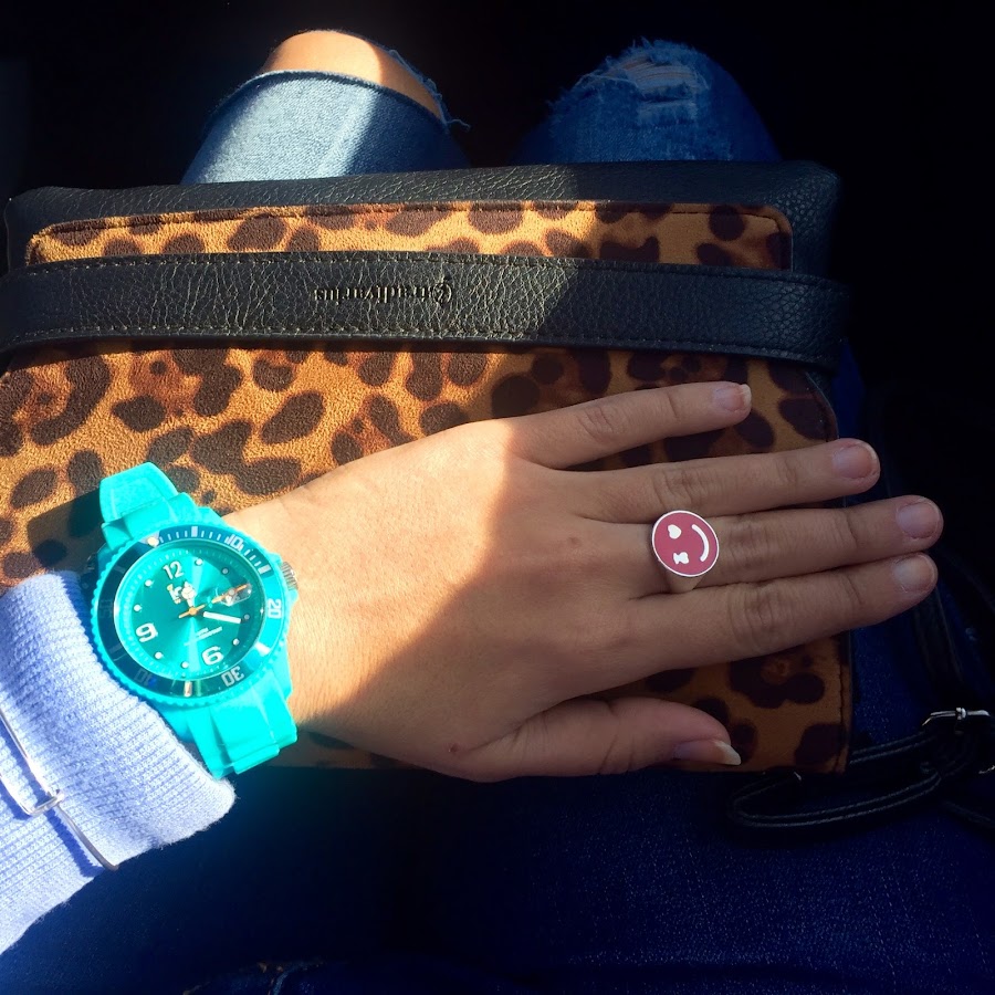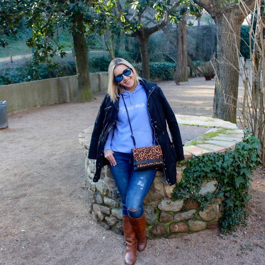 Para recorrer la ciudad, escogí un look cómodo y sin complicaciones: mis nuevos tejanos ripped, mi sudadera azul de Puma y una parka para protegerme del frío. Los accesorios del look fueron unas botas planas y cómodas en color marrón y mi bolso con estampado animal print que le da el toque chic al look.