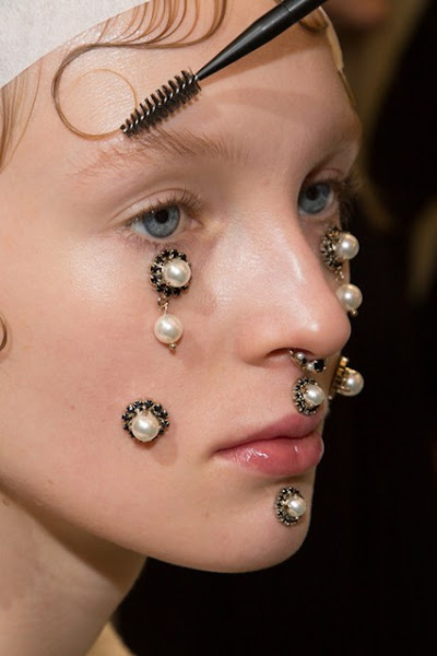 Riccardo Tisci once said that the mark of a successful designer is having an identity. He has that in spades. We can see beautiful face jewellery employed in this Autumn-Winter 2015 collection (Yes, I know this is an Autumn-Winter post but I can"t waint to showing you!) Jangling nose rings, cheek "piercings" and dramatic ear decoration proved the perfect accoutrement to tightly braided hair and kissing curls.