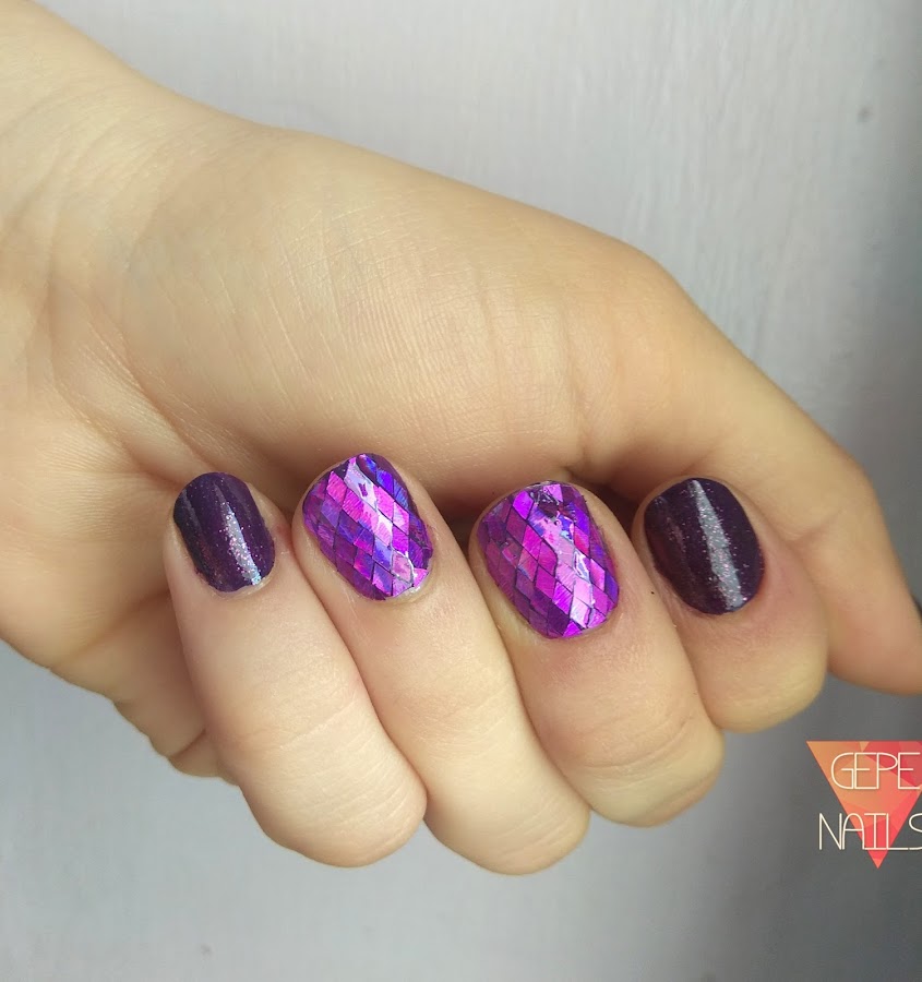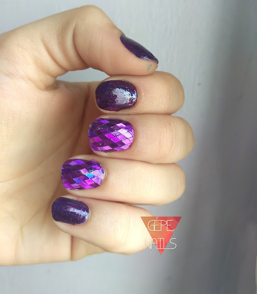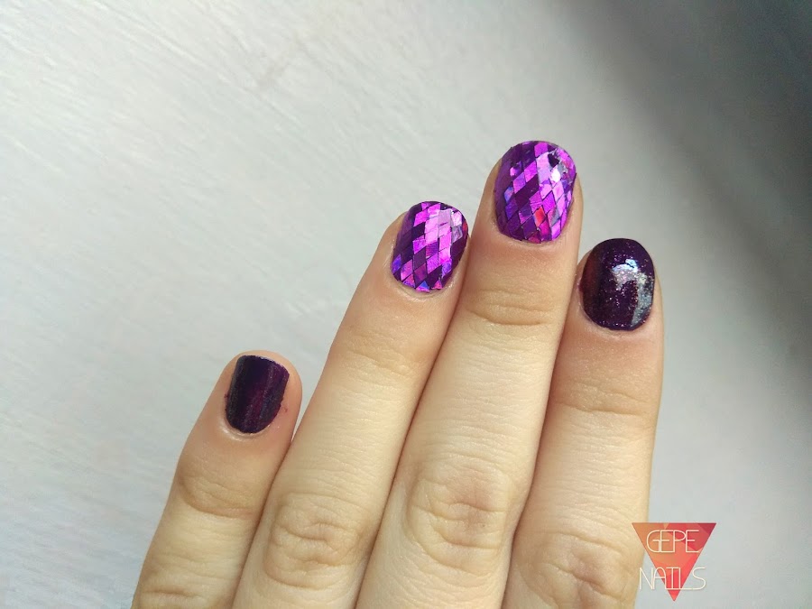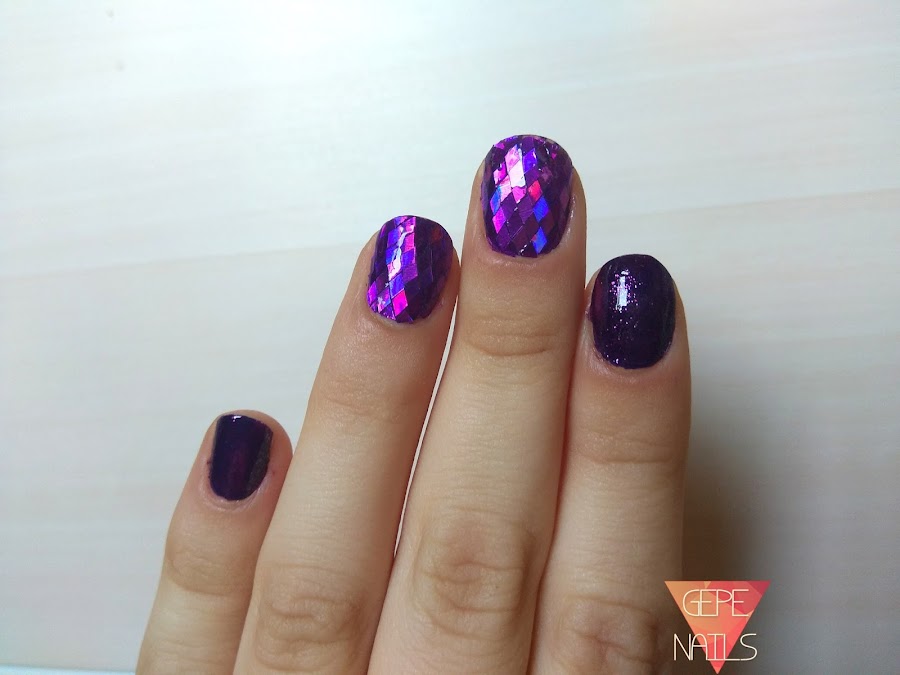 Para hacer esta manicura he usado dos capas de morado en todas las uñas, aunque en las 2 que he seleccionado para poner los glequins, o rombos, solo puse una.