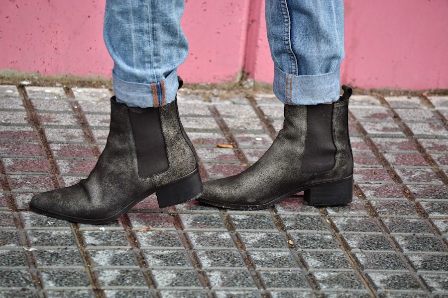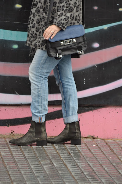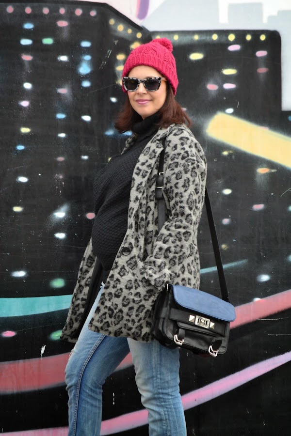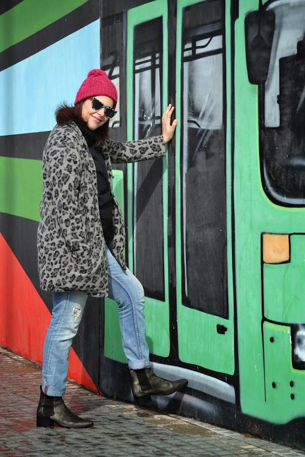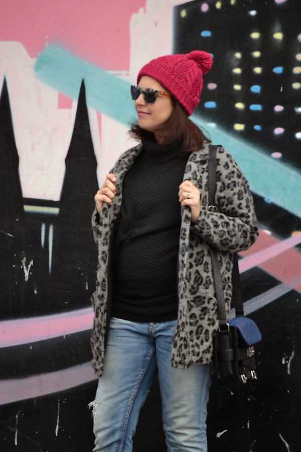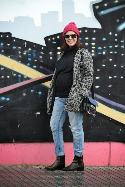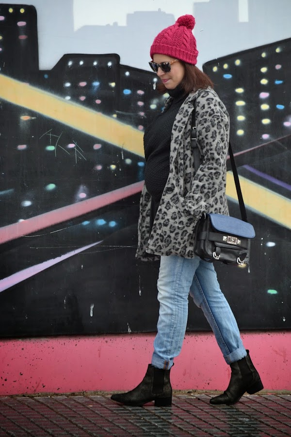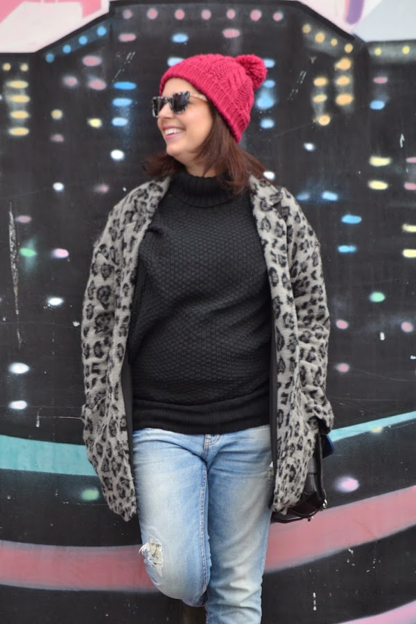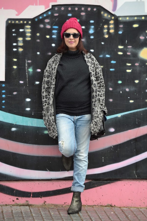 Un look con maxi abrigo que adquirí las rebajas del invierno anterior y que es un fondo de armario, ya que el print de leopardo va y viene. Este es en tonos grises. Ya lo saqué una vez por aquí. Es muy cómodo y calentito. Lo combiné con boyfriend jeans, jersey de lana negro y de calzado mis nuevas botas chelsea que pille en el Black Friday. Estoy encantada con ellas. Son de piel y tienen ese toque glitter que las hace diferentes. Para darle color, me puse el gorrito de lana burdeos .