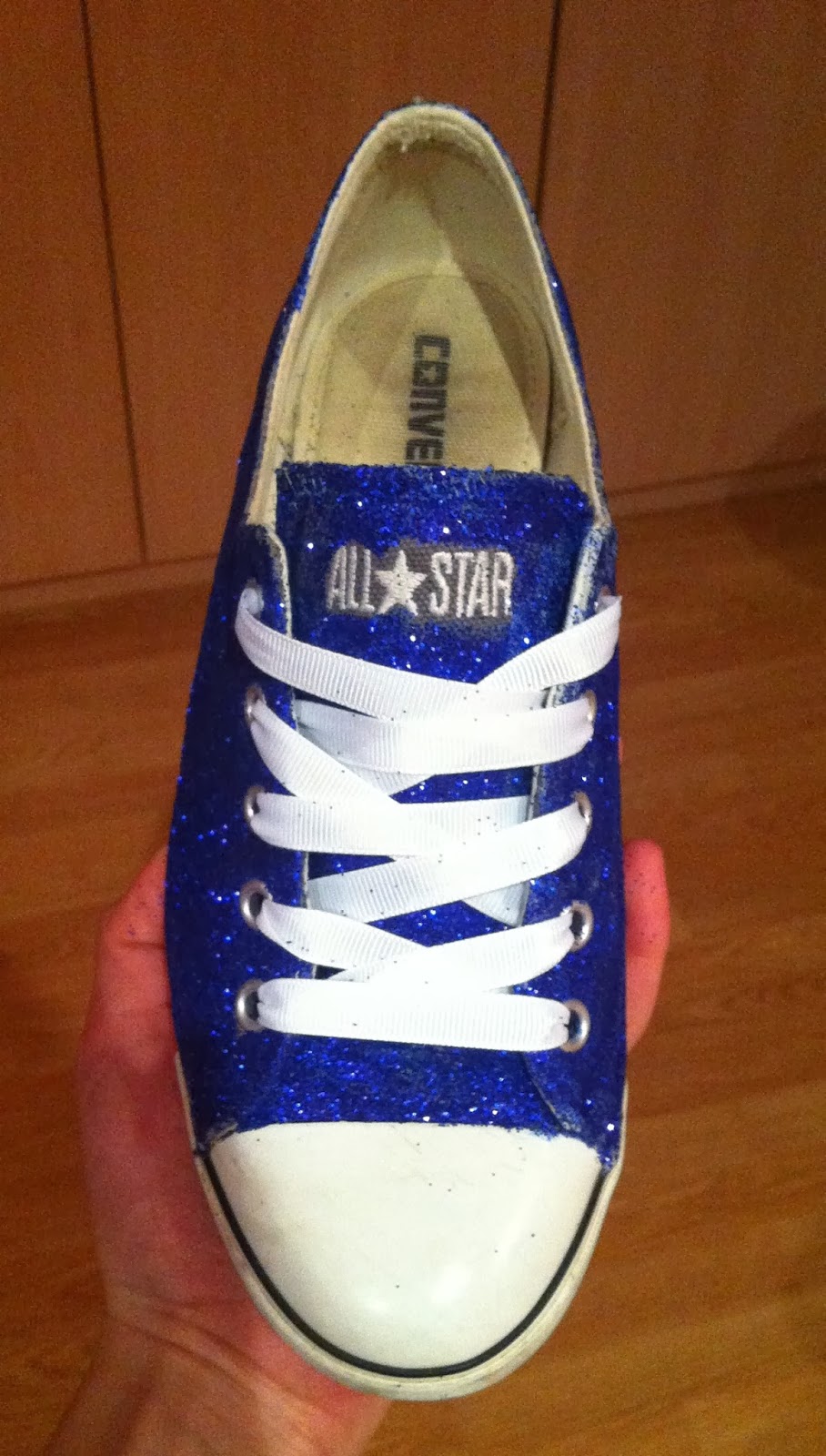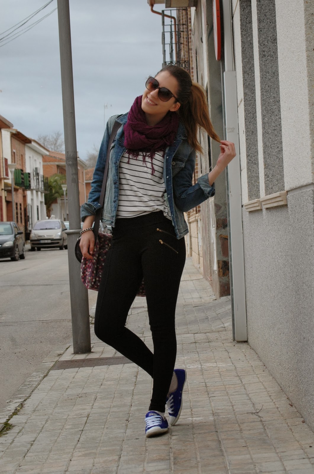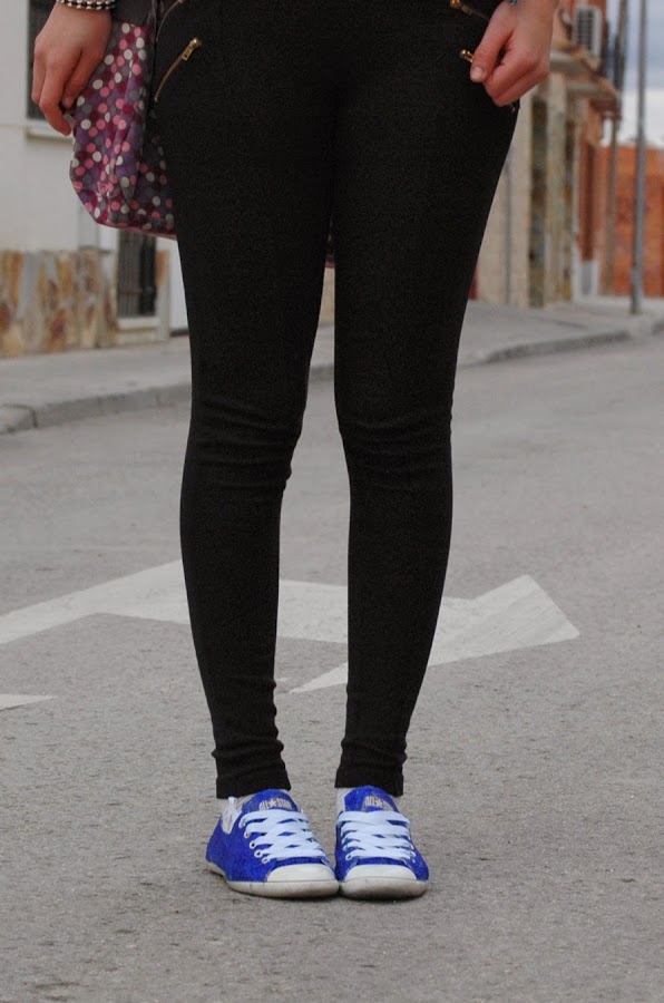 Hola a todaaas!! entre exámenes, prácticas, estudiar, etc.. me está siendo complicado actualizar tan a menudo como me gustaría.Es el último mes de universidad..Así que estoy a tope ;) Estos días de dormir poco, estrés, días interminables en el campus, ajetreo, etc.. procuro llevar ropa cómoda, son muchas horas de fuera de casa..Pero si algo tengo claro es que aunque la ropa sea cómoda me tiene que hacer sentir bien. Además, esta semana la lluvia nos da un respiro y podremos sacar esos colores llamativos que quedaron atrás hace ya tiempo.Y una vez dicho esto, os quiero contar una idea que tuve. En mi armario no faltan las zapatillas tipo Converse, pero hace un par de meses las lavé y quedaron totalmente desteñidas.. Después del disgusto y de tenerlas aparcadas durante un tiempo se me ocurrió hacer algo para recuperarlas.. Su color original era azul marino, tras el lavado quedaron grises. Fui a una papelería, compre un par de botes de purpurina azul, cola y pinceles.. Y me puse manos a la obra: