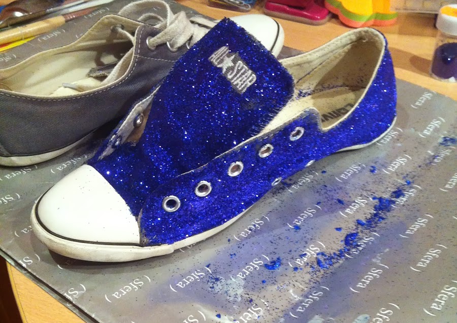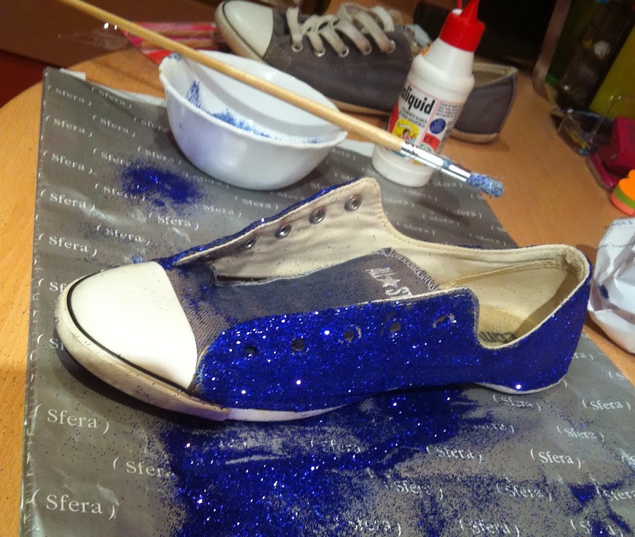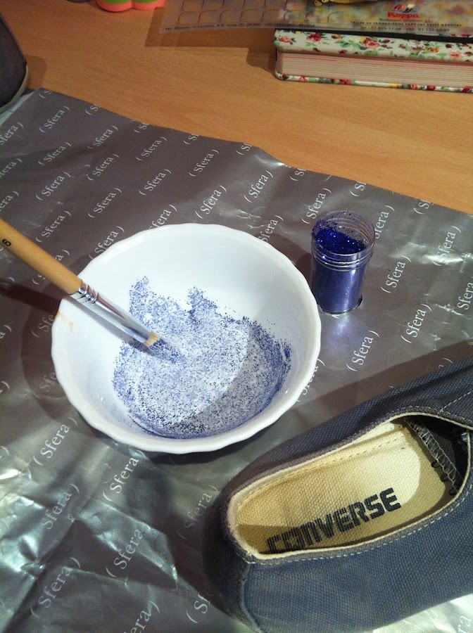 2. En segundo lugar, con la zapatilla llena de cola empecé a espolvorear la brillantina, de manera que quedó así: