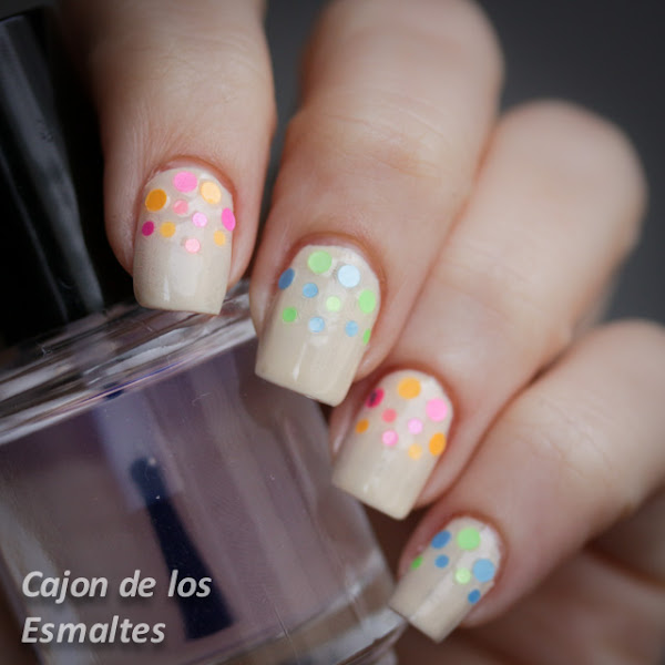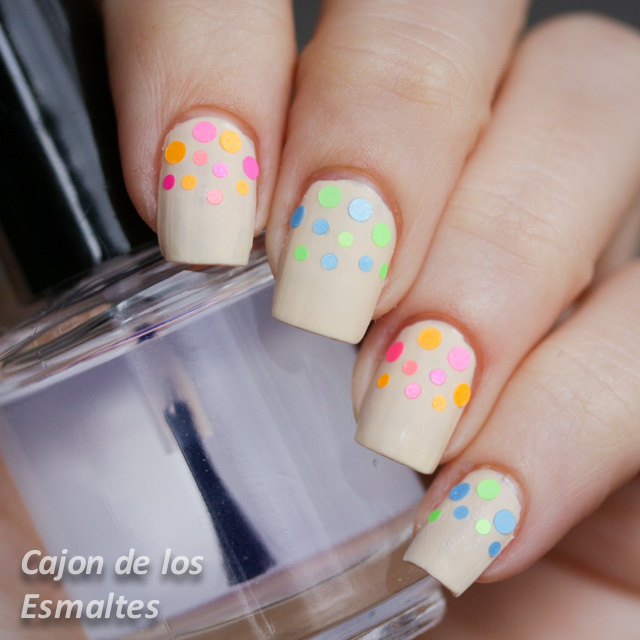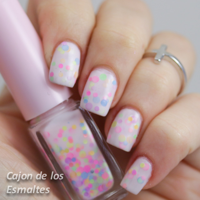 Abajo pueden ver mi "experimento", tres capas en las dos primeras uñas y dos en las segundas. En retrospectiva hubiera usado una capa de blanco de base o agregar unas gotas de esmalte blanco al frasco. El resultado queda super delicado (y estamos hablando de glitter neón) y se asemeja bastante a las colecciones que otras marcas han sacado ya sea indies como Polish Me Silly o "oficiales" como Yes Love. Así que si le tenían antojo a esos esmaltes ahora pueden hacerlos en la comodidad del hogar, agregando unas gotas de otros tonos pueden alterar el color de base.