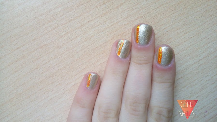 Acto seguido, pinté la raya con naranja fosforito, y antes de que se seque, hay que volcar purpurina encima. Cuando ya lo tengamos, retiramos el celo con cuidado, y dejamos secar un poco antes de poner una capa de brillo o top coat.