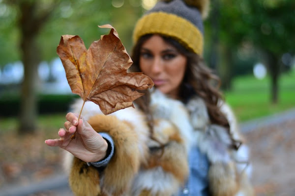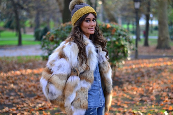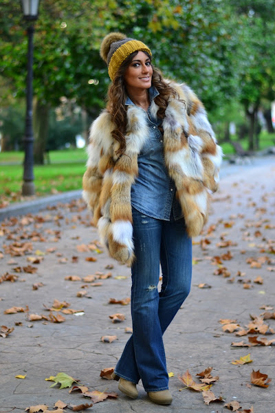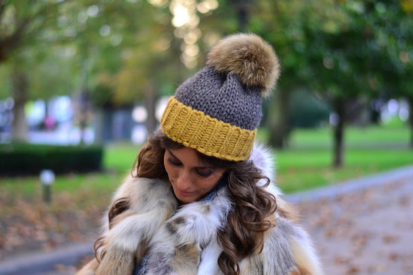 Como veis, me he puesto esta prenda tan del momento sobre un total denim look y, como único complemento, un gorrito de lana con pompón de pelo de marmota.
