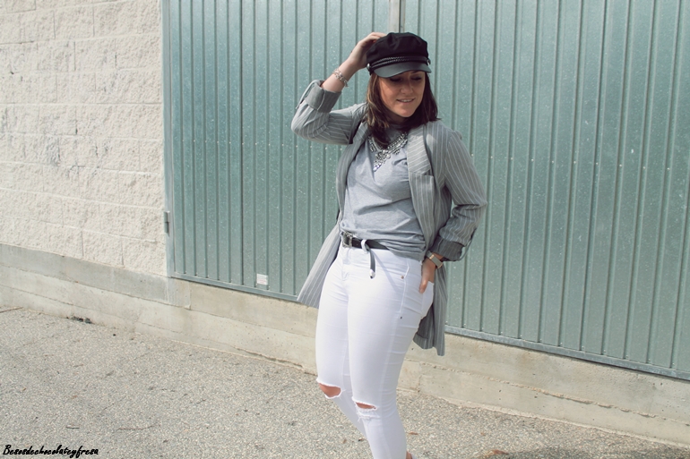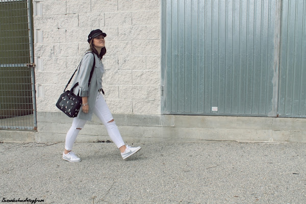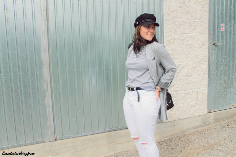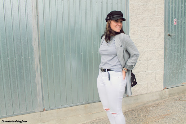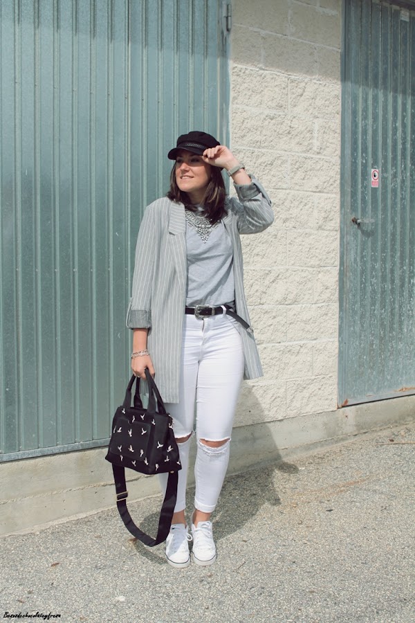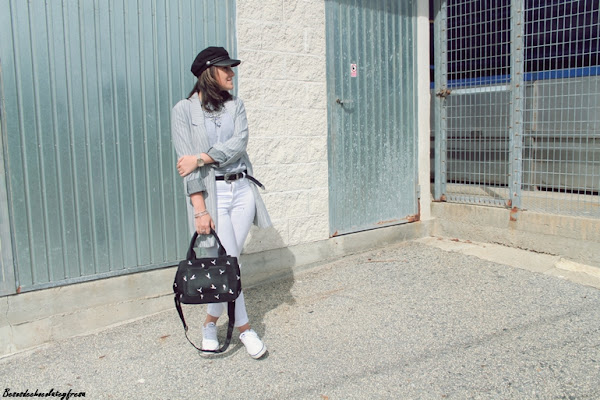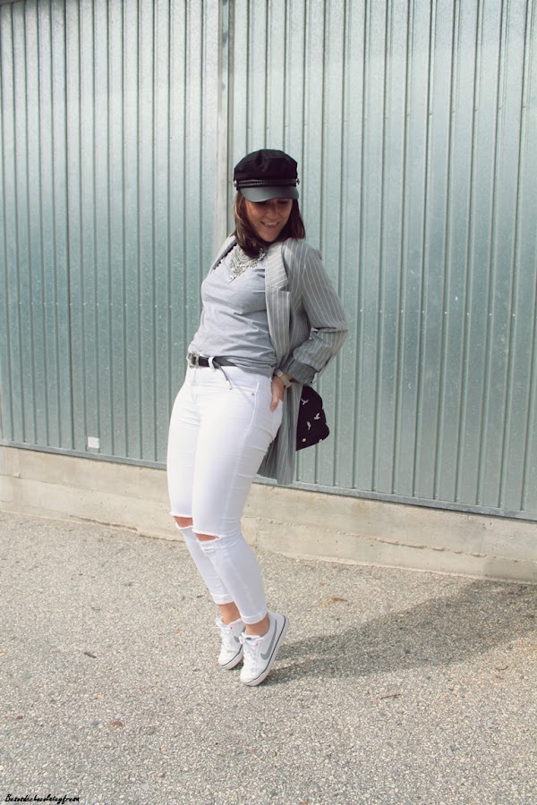 Para esta ocasión (una de muchas, por que le daré muchisimo uso este invierno) aposte por un look sport y a la vez elegante para ir de comida familiar. Blazer de rayas y corte oversize, jeans blancos, sneakers y como complementos opte por maxi-bolso con estampado de animales, cinturón tipo "cowboy" y maxi collar en plata.