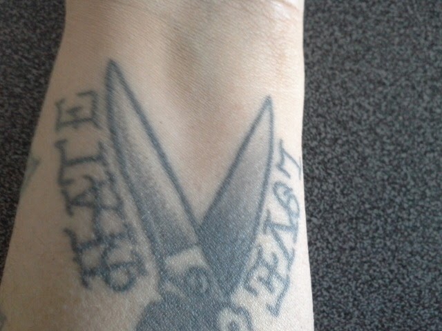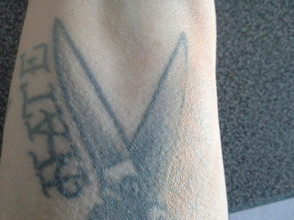 A continuación os voy a mostrar dos fotografías. En la primera podéis ver uno de mis tatuajes y en la segunda como el Dermacolor ha cubierto una parte de este. Solamente he utilizado dos capas muy finas de producto y lo he sellado con polvos traslúcidos.