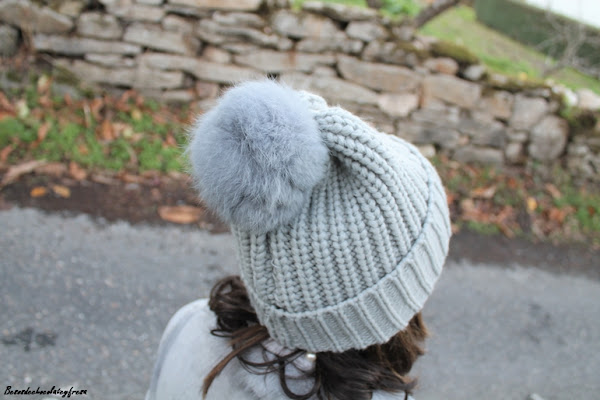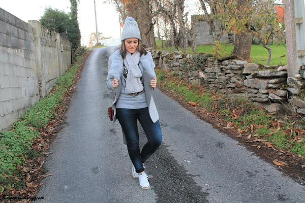 En esta ocasión decidí combinarlo con más gris en el sweater con estampado, estola con pelas y peluche también en gris y gorro con pompón también en el mismo color.