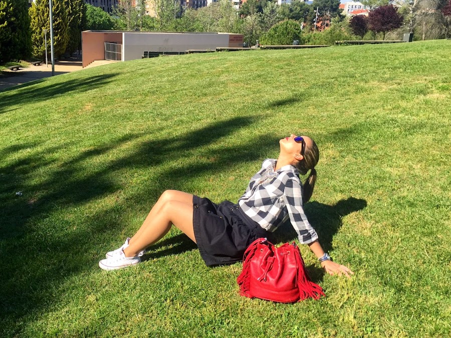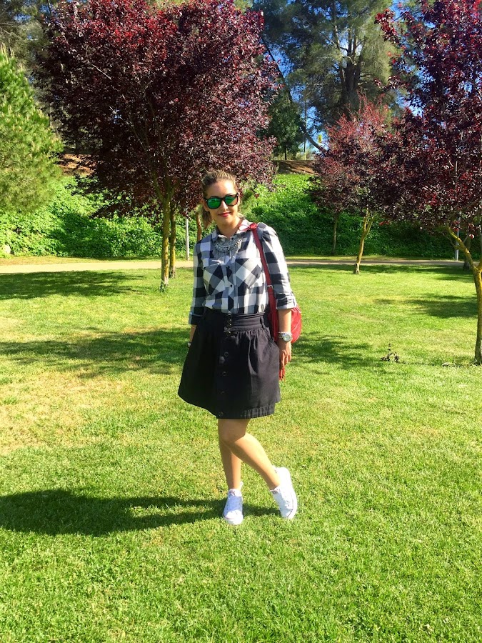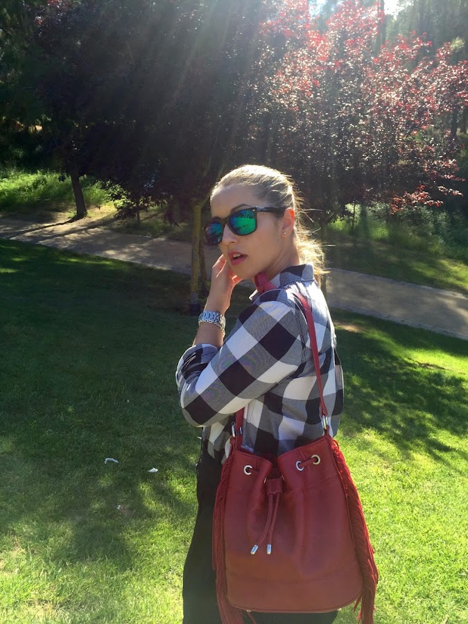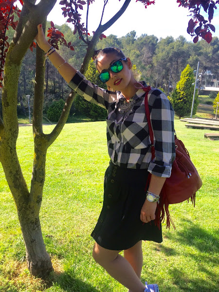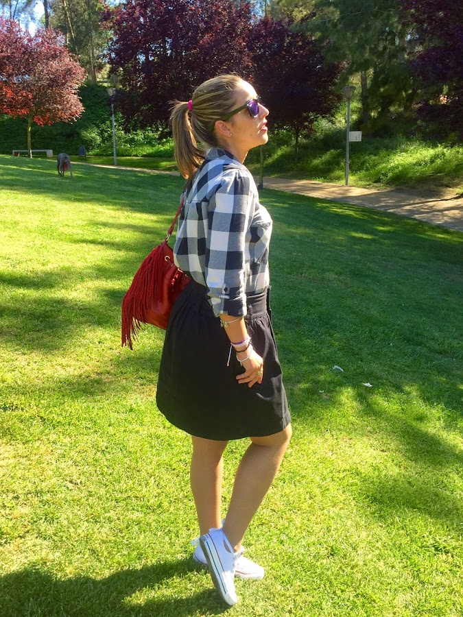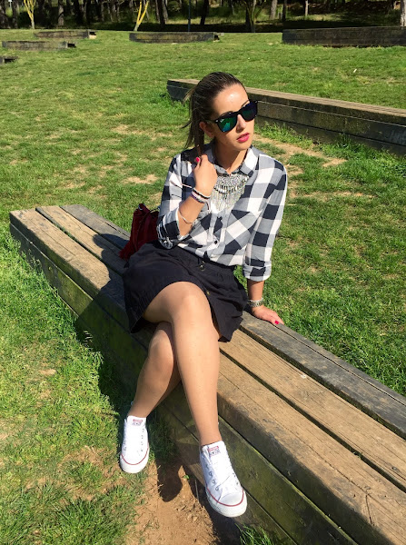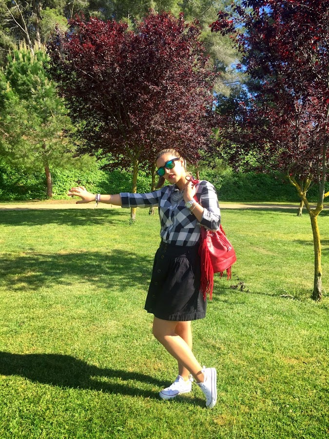 Good night babies! We start a new week with an outfit that reminds me to the film "Grease". In the outfit of the day, I wore a plaid shirt in black & white with a black skirt and my white converse. To give a touch of colour to the outfit, I wore it with my red bag with fringes and my new necklace of Bershka.