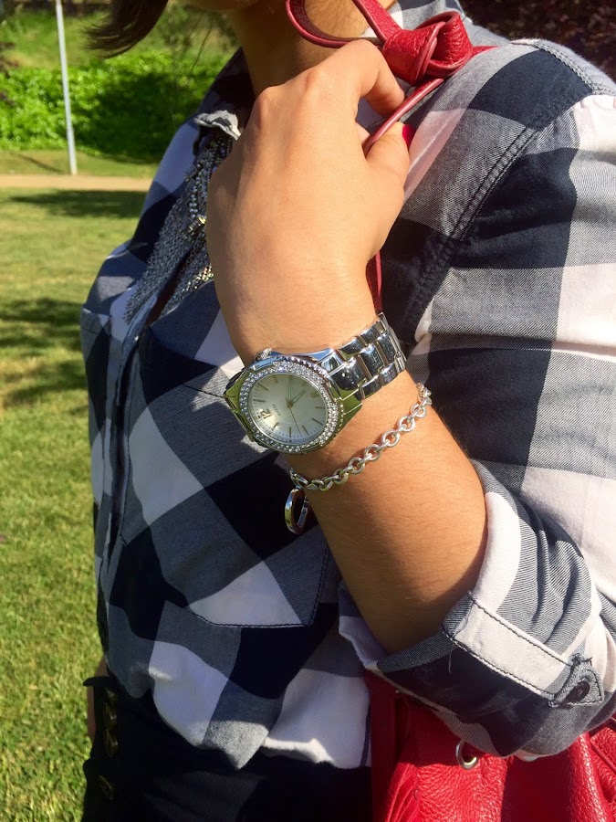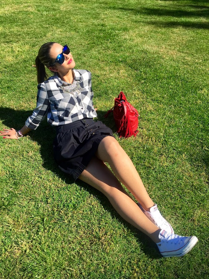 ¡Buenas noches bombones! Empezamos nueva semana y hoy os traigo un look que me recuerda mucho a la película Grease. En él look de hoy llevo camisa de cuadros en blanco y negro que combiné con una falda negra y mis converse blancas. Para dar un toque de color al look, me puse mi bolsito de flecos rojo y mi nuevo collar de Bershka.