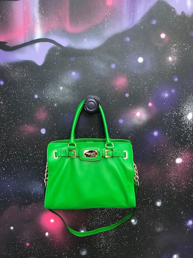 Como complementos, maxi bolso en color verde y zapatos de glitter.