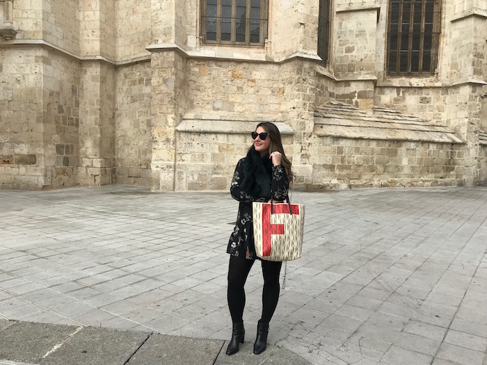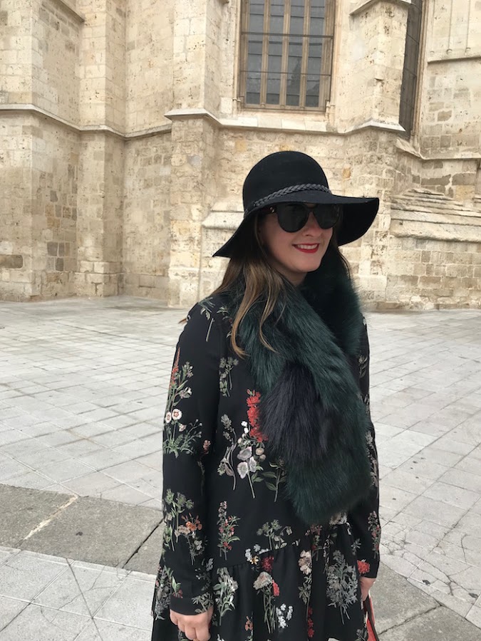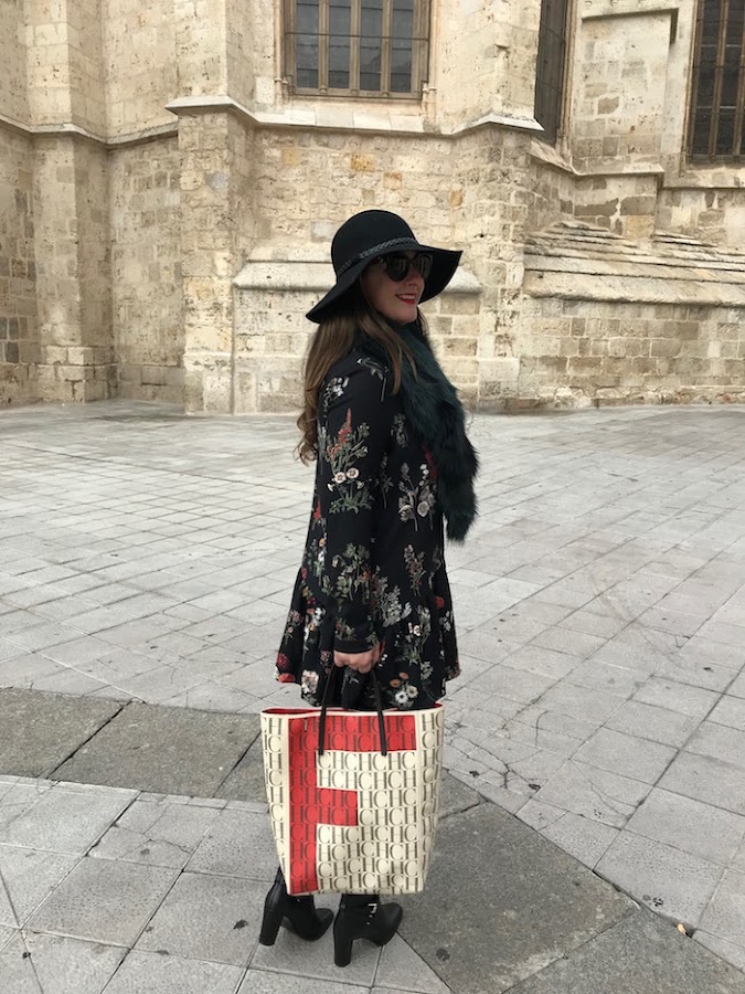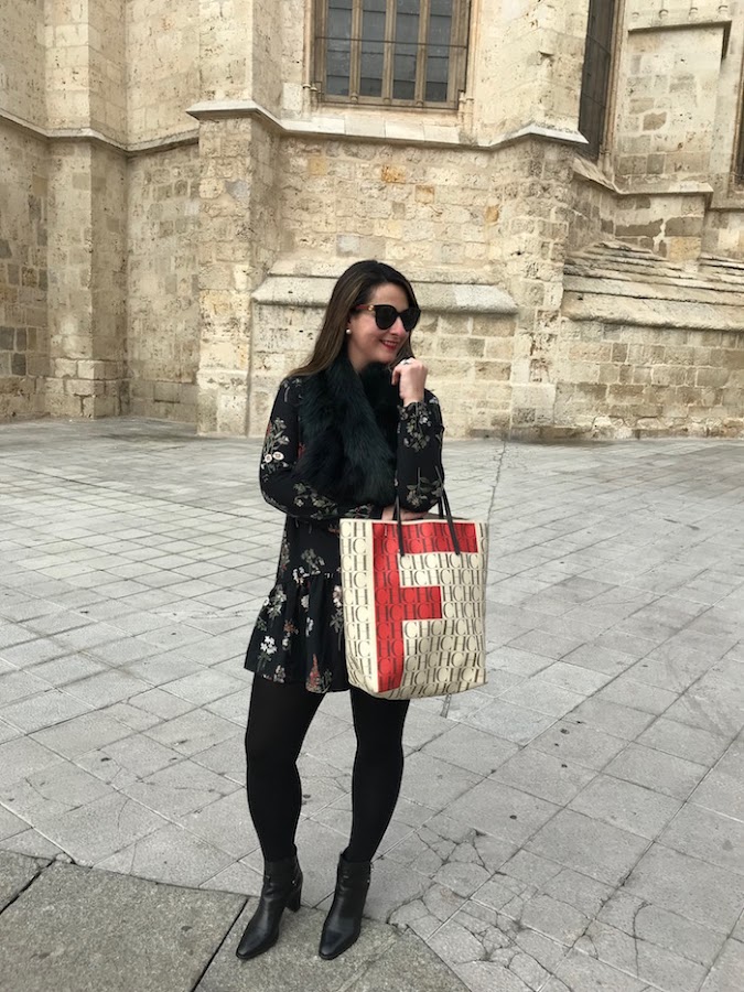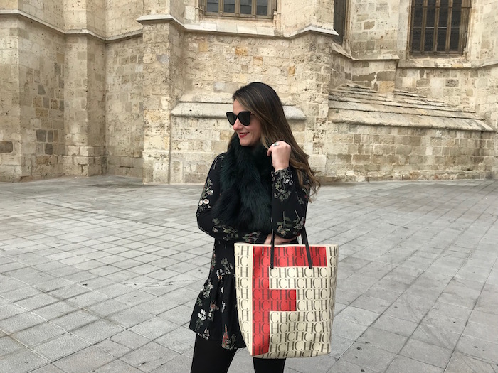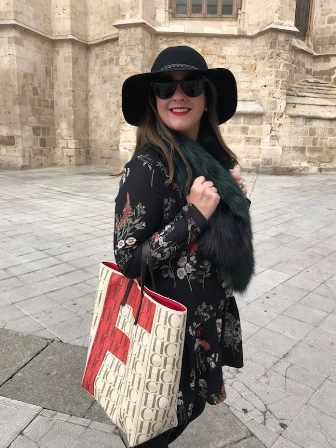 El look que os traigo hoy está formado por un mono en color negro con estampado de flores que combiné con botines, cosa poco habitual en mi, pero este año creo que va a ser una de mis apuestas seguras. Estola en color verde, uno de mis complementos top de este año y maxi bolso personalizado de Carolina Herrera complementan el look.