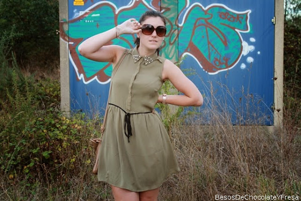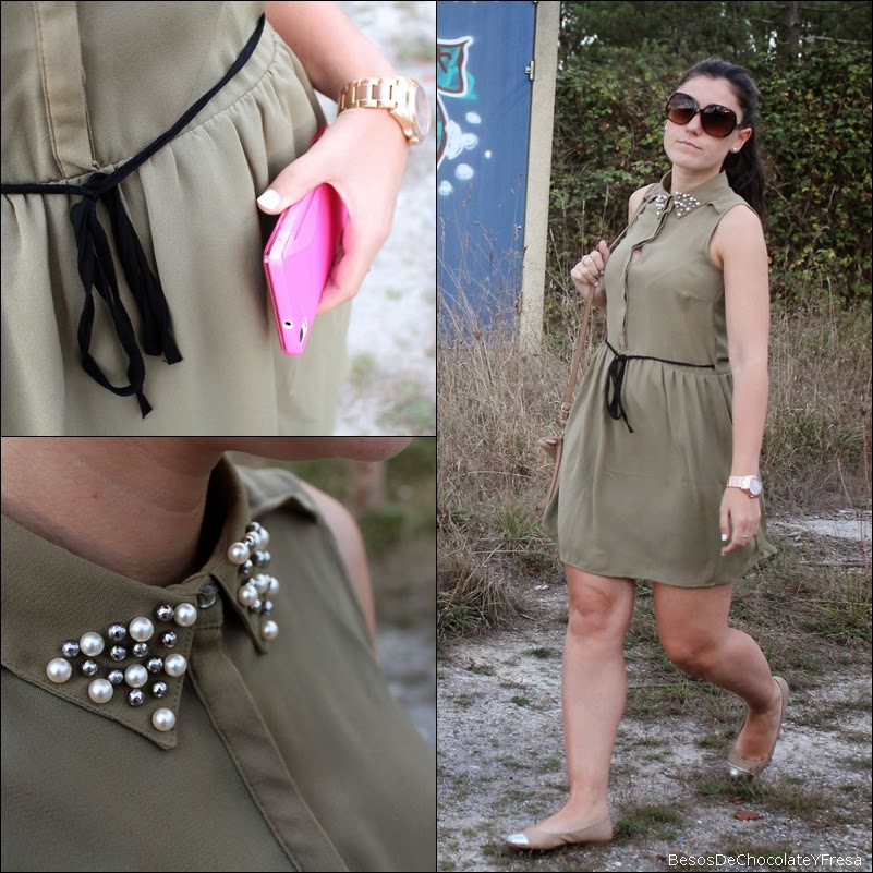 Os enseño un look que me puse el pasado Viernes para hacer unos recados. Llevo vestido en color verde kaki con cuello de perlas y cinturón en negro que se puede poner tanto hacia delante como hacia atrás. Como complementos todo al nude, bolso, bailarinas y reloj.